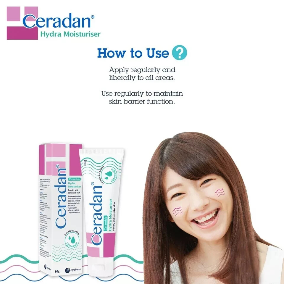Ceradan® Hydra Moisturiser Lightweight Hydration for All Skin Types Product Overview: Ceradan® Hydra Moisturiser is a light, non-greasy moisturizer designed to deliver long-lasting hydration while supporting the skin’s natural barrier. Enriched with a ceramide-dominant blend of essential lipids and sodium hyaluronate, this formula locks in moisture, keeping your skin feeling soft and nourished. Suitable for all skin types, even dry and sensitive skin, its lightweight texture makes application easy and comfortable. Key Features: - Boosts Hydration & Moisture Retention: Formulated with sodium hyaluronate to deeply hydrate and help the skin retain moisture throughout the day. - Supports Skin Barrier: Contains ceramides in an optimal ratio to strengthen the skin’s protective barrier, essential for dry or sensitive skin. - Lightweight & Non-Greasy: This fast-absorbing, light-textured moisturizer is perfect for daily use on all skin types. - Gentle on All Skin Types: Suitable for adults, children, and even newborns with sensitive skin. Usage Directions: For external use only. Apply regularly to all skin areas or as directed. For best results, use consistently to maintain skin hydration. Benefits: - Deeply hydrates while helping skin retain moisture - Ceramide-rich formula supports skin barrier repair - Safe for sensitive, dry, and all other skin types - Suitable for all ages, from newborns to adults Ingredients: Key ingredients include ceramides, sodium hyaluronate for hydration, and jojoba seed oil for soothing moisture.