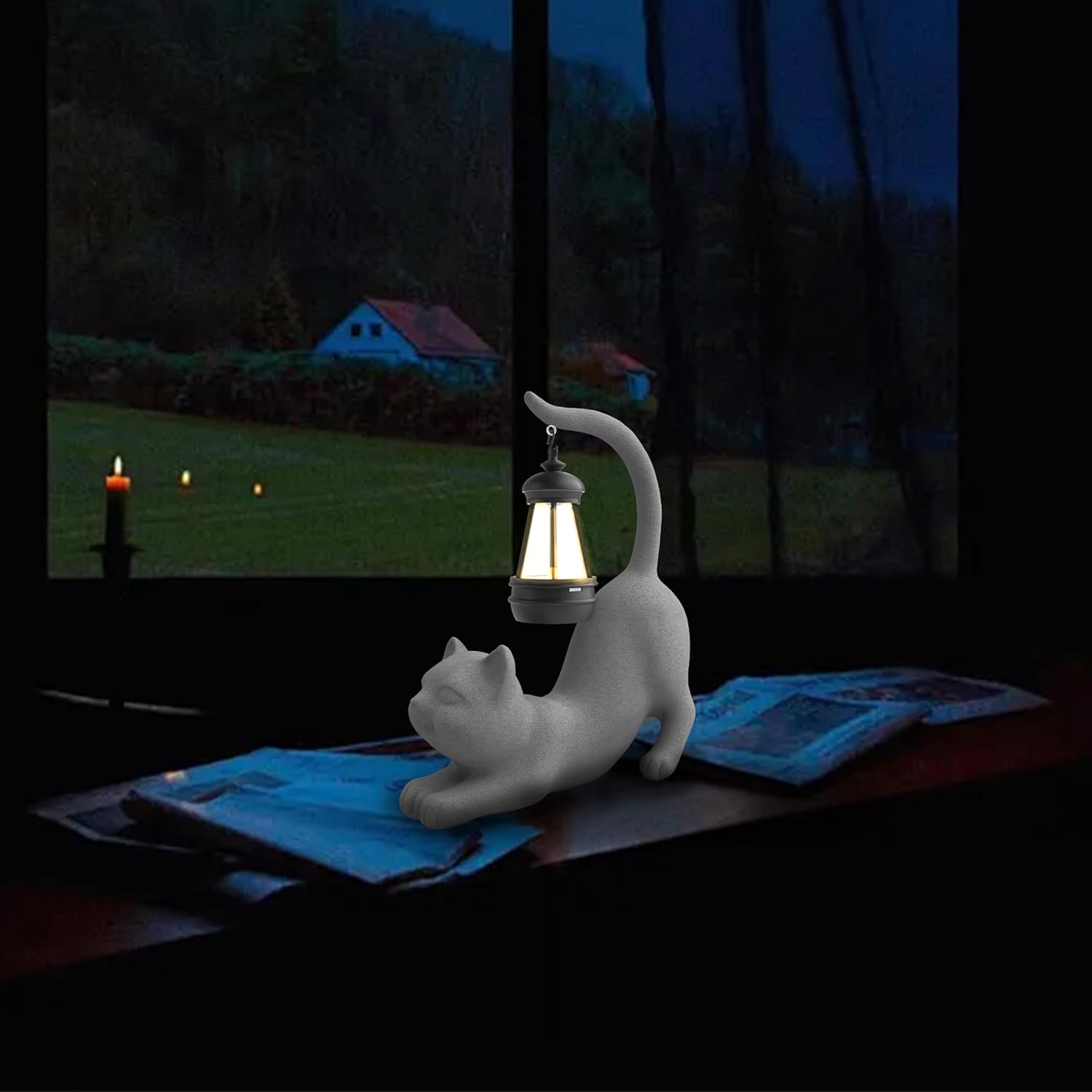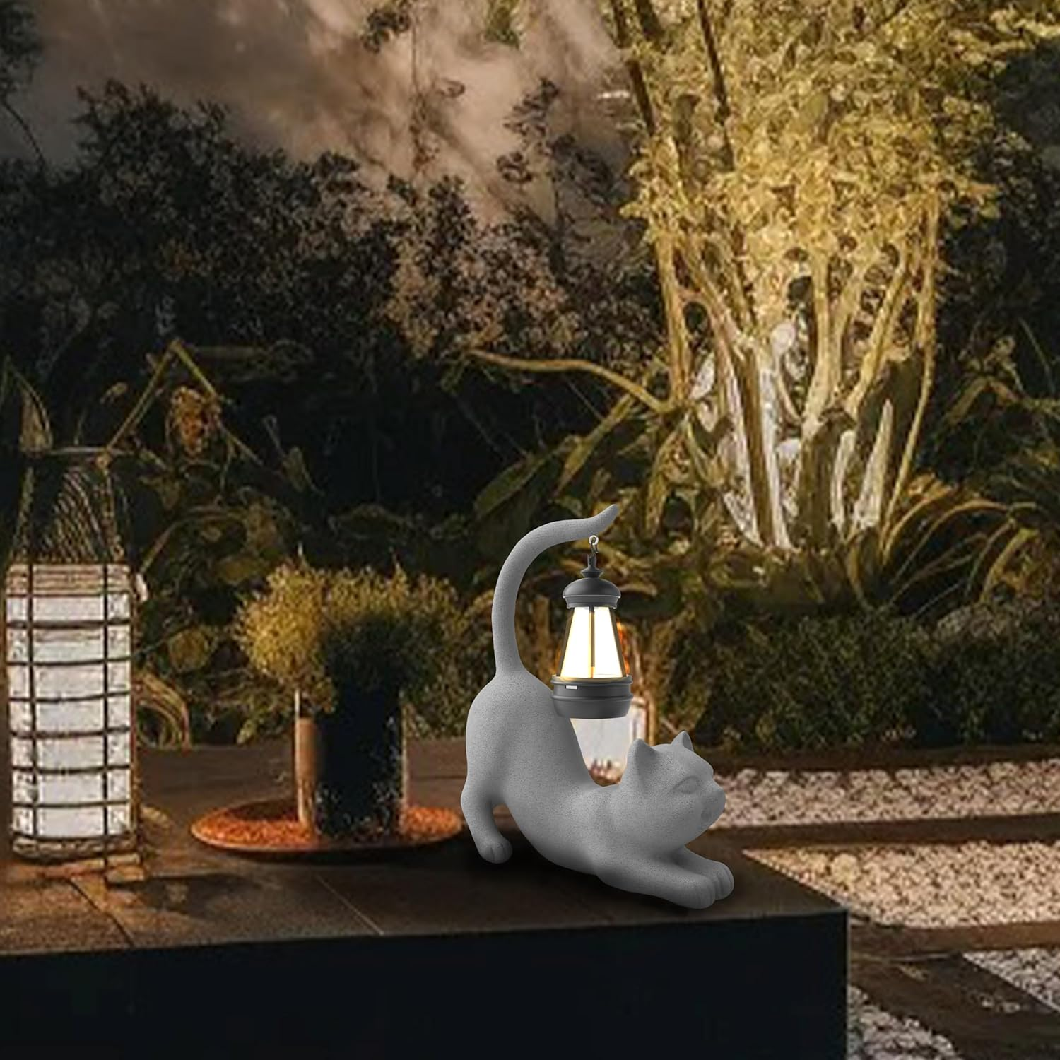 Diverse Modeling: The design is diverse and interesting, with playful and lively postures and expressions; three models (holding a pole/tail-up/lying) are all available in three colors to meet different preferences Durable Material: Be made of high-quality resin to withstand sunny, rainy and other weather conditions without cracking or fading, thus ensuring long-lasting beauty and functionality Addition to the House: A perfect addition to the decor in the garden, outdoors, patio, lawn, yard, front porch, balcony, backyard, walkway, and many inside areas, together with illumination, making your home adorable and charming Ideal Gift: Ideal choice of memorable gifts for many occasions and people - presents for children, friends, father, mother, families, colleagues etc. at birthdays, anniversaries, Christmas, housewarming and so on Portable Size & Easy Operation: 8.1"×3.5"×9.8". For the first use, turn the switch to “ON”, simply leave it charging in the sun (in case the energy runs out after a long period of time out of the sun during transportation), and it will automatically light up at dusk Product Description Solar Garden Statue Lights 10 Inch Outdoor Cat Resin Figurine Lights Crafting Joy - Light up your home and life Outdoor Figurine Light Instructions Open the package, take out the product, and hang the light on the figurine. Set the light switch to “ON” (it must be "ON" when charging) . Leave it in the sun to charge for about 8 hours. When night falls, the light will automatically light up. Long-distance transportation may lead to power depletion, so it is recommended to charge first. The intensity of the sunlight will affect the length of time it takes to be fully charged. Three Styles of Cat Series Cat standing up A standing cat holding a pole with a solar LED light Cat stretching A comfortably stretched cat with a solar light dangling from its own tail Cat lying A lying cat playing with a solar light hanging from its own upturned tail Available colors ● Grey ● White ● Beige Available colors ● White ● Grey ● Beige Available colors ● Beige ● Grey ● White Cats Show There will be one of the three styles appealing to you 1 Style Display 2 Details 3 Weather Resistance 4 Solar Powered 5 Warm Glow Gift-giving SPECIAL GIFT FOR YOUR LOVE With fluid lines, plain & elegant color and diverse designed styles, the lovely and interesting outdoor figurine lights are suitable for many gift-giving occasions, such as birthdays, Mother's Day, Valentine's Day, anniversaries, celebrations and so on. Add a Fun Touch to Your Outdoor Space This outdoor craft decoration is suitable for any place with direct sunlight and will create a fantastic atmosphere to the garden, patio, porch, backyard, lawn or pathway at night, making it a delightful gift for garden enthusiasts.