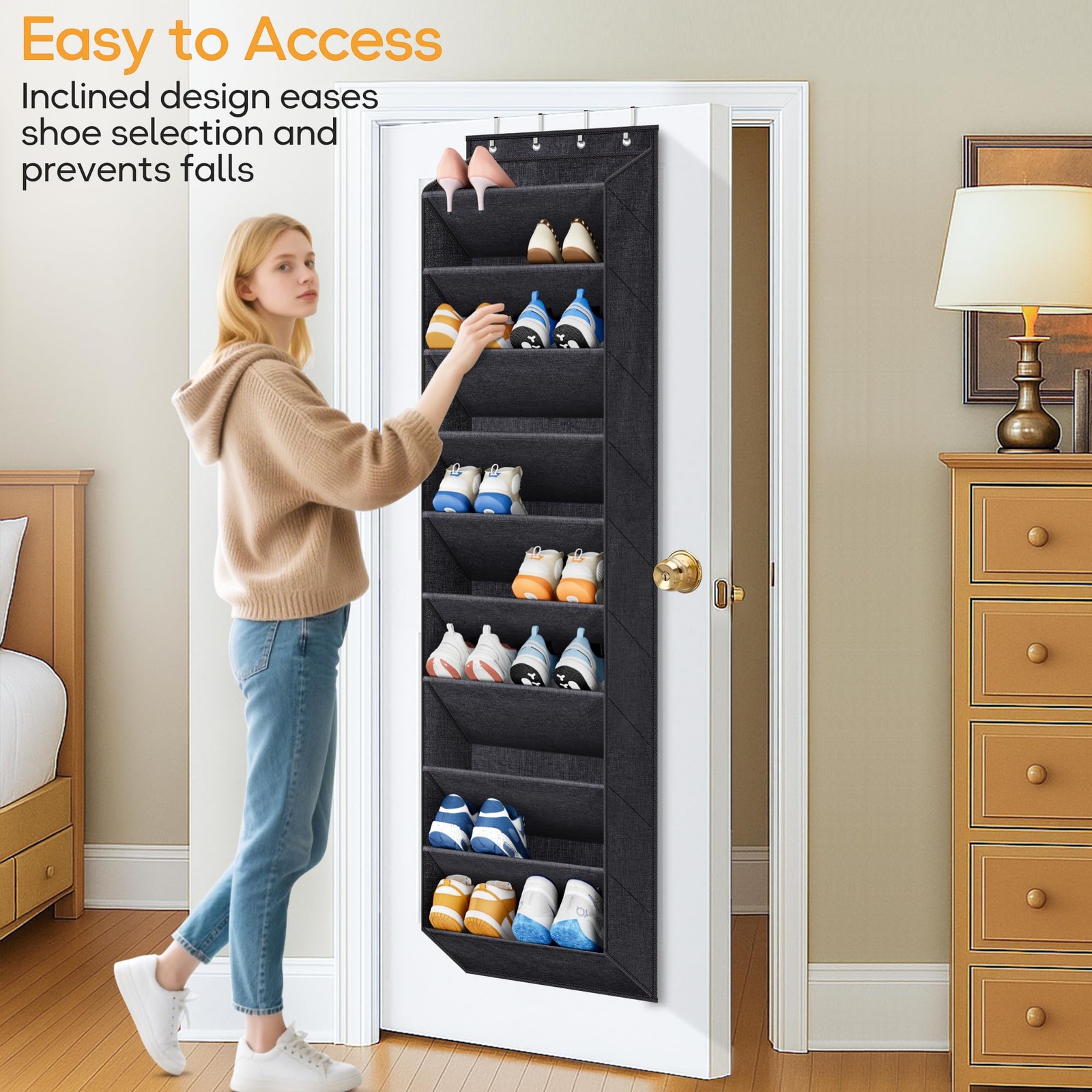 Transform your closet organization with this versatile shoe rack for closet featuring 10 spacious tiers that can accommodate up to 20 pairs of shoes. The oxford fabric construction of over the door organizer offers a modern aesthetic while providing sturdy storage for various types of footwear, from athletic shoes to heels. Each tier of hanging shoe organizer for closet door is thoughtfully designed with ample space to keep your shoes visible and easily accessible. The behind door shoe organizer hanging maximizes vertical space utilization and requires no installation - simply hook it over any standard or narrow door. The sturdy fabric material maintains shape of shoe hanger while protecting your shoes from dust. Wall shoe organizer is great for small spaces, apartments, dorm rooms, or any area where shoe storage is needed. Over the door shoe holder's practical design allows you to see all your footwear at a glance, making outfit coordination effortless. Keep your floor clear and your shoes organized with this space-saving shoe rack door organizer that brings order to your daily routine. 10-Tier Capacity for 20 Pairs: Over door shoe organizer measures 9"D x 16.7"W x 70.5"H with 10 tiers that optimizes vertical space. Shoe rack for door is suitable for family's tennis shoes, sandals, slippers, and high heels. The lower layers make it easy for kids to grab shoes Deep Pockets for Size 13 Shoes: Shoe organizer door hanger features 9" deep pockets for sizes 7-13 shoes, holding 2 pairs of size 11 sneakers or 1 pair of size 12 short boots without deformation. Slanted design ensures easy access and prevents falls when opening/closing doors Fit Standard & Narrow Doors: Over the door shoe rack comes with hooks that fit doors 1.37-1.65" thick, needing only 0.08" clearance above the door. At 16.7" wide, hanging shoe organizer closet maximizes storage while saving space behind the door and won’t block handles No More Sagging: Back of door shoe organizer has 4 widened metal hooks for reliable strength. Crafted from premium oxford fabric, door organizer is breathable, dust-proof, and tear-resistant. Fiberglass tubes sewn into front fences prevent it from sagging, even when full Versatile Shoe Storage: Easily hang it on most doors, such as closet, bedroom, bathroom, dorm, garage, or pantry—no tools needed. Shoe holder for door is great for shoes, bags, hats, scarves, toys, toiletries, diapers, and more to keep your space neat and organized!