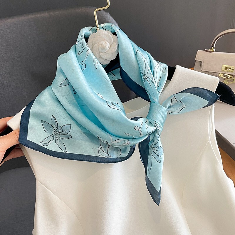 100% Pure Silk 21'' Scarf Women Beige Gray Flower Kerchief Small Square Bandana