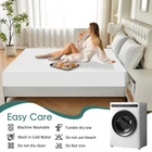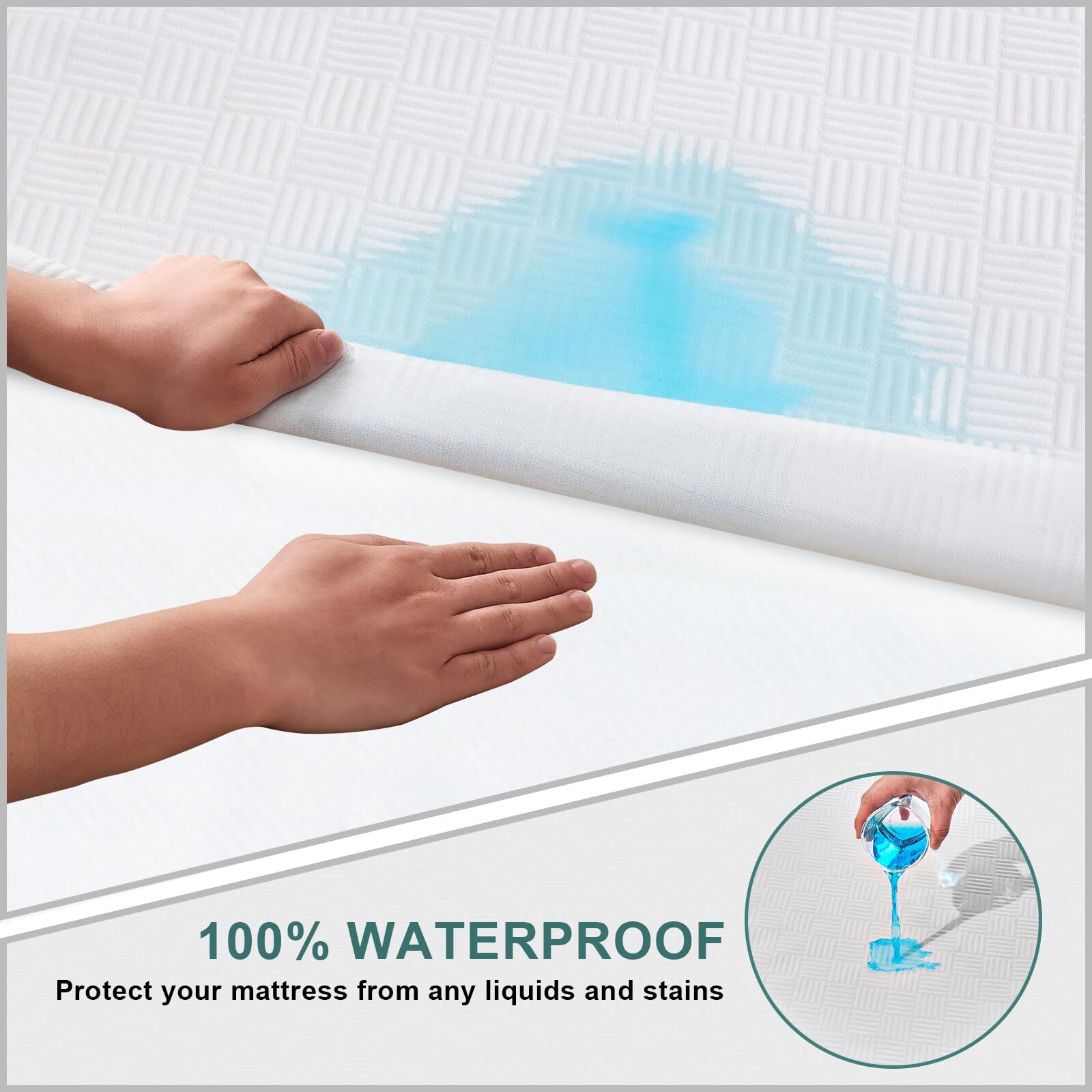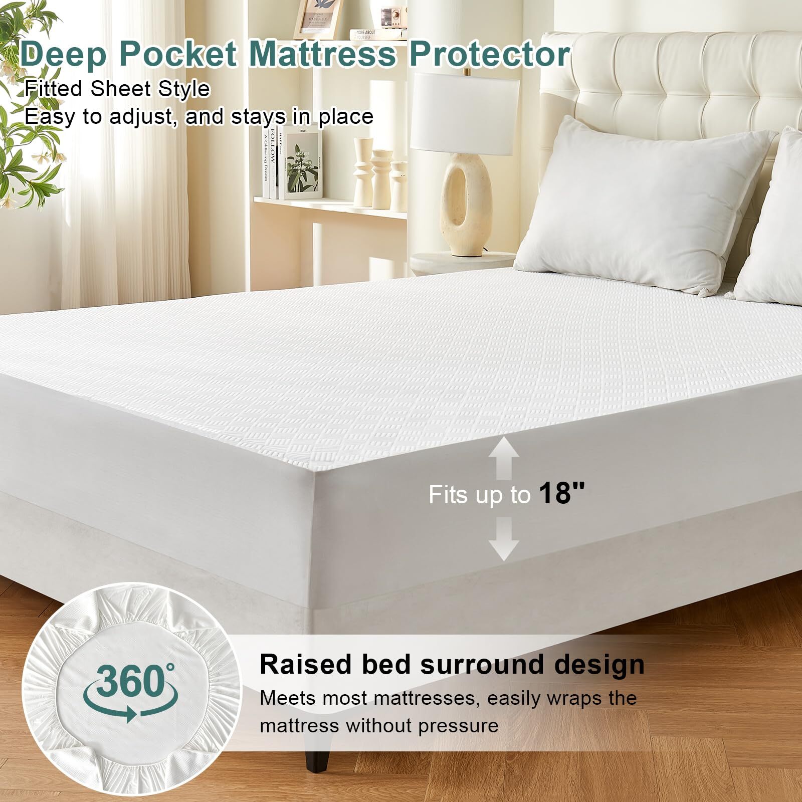 100% Waterproof Mattress Protector: This queen size mattress protector is lined with a high quality waterproof TPU membrane backing, the upgraded waterproof membrane does better jobs to protect from sweat, urine, and any liquid leakage through your mattress. Perfect for families with babies or pets, bring you and your family a healthy sleep Soft & Breathable 3D Air Fabric: Queen waterproof mattress cover is made of premium skin-friendly microfiber and has good wicking properties, ensuring unparalleled softness and breathability, and the noiseless design offering a cozy and peaceful night's sleep. And the waterproof mattress pad has a diamond quilted top that makes the pad more supportive. It not only prevents the filling from running out but also reduces the heat and moisture of your mattress 360° Deep Pocket Design: deep pocket waterproof fitted sheet fits mattresses from 6 to 18 inches tall, with strong 360º elastic bands that provide full protection, no matter how you move on the bed, this mattress cover will stay in place all the night Easy to Care and Clean: Machine wash cold separately on GENTLE/DELICATE cycle. This waterproof bed cover remains waterproof even after being twisted and machine-washed many times.We would recommend purchasing 2 waterproof mattress protectors, so you will have a replacement when accidents occur. Notice: Tumble dry on low, do not dry clean, do not iron, do not bleach, preventdamaging the TPU baclomg Bedding Essentials & Great Present Idea: Our Mattress cover queen size bed will elevate your bedroom, guest room, kids’ room, and more. Great choice for moms, dads, men, and women on birthdays, Mother’s Day, Father's Day, and Christmas. It's also perfectly suited for University dormitories, short-term rental hotels, hospital beds, sleeper sofas, or those undergoing therapee bedwetting treatment, making it a truly multipurpose addition to your bedding essentials Customer Service: If you are not satisfied with our product, please don't hesitate, contact us anytime, our support dedicated team will reply to you ASAP