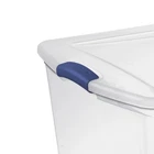 Organizing is easy with the versatile 105-Quart Clear Locking Storage Bins! The clear base and lid make it easy to see and find stored items from any angle. The colorful locks secure the lid to the base to keep items securely stored. The recessed lids allow the bins to be stacked to efficiently utilize vertical space. This large bin is perfect for organizing bedding, blankets, seasonal clothing, sports gear, decorative items, and other bulky items. It's the ideal solution to a variety of storage challenges, helping to keep closets, bedrooms, craft rooms, and dorm rooms organized! 105-Quart Locking Storage Box, Clear Storage Box with Lid, Blue Lock Exterior Dimensions: 32 1/8" x 19 1/8" x 13 3/4" Interior Dimensions at Bottom: 27 1/8" x 16 1/8" x 12 7/8" Transparent lid and base for easy identification of contents from any angle Colored locks keep lids secure and items stable Large capacity is a popular solution for storing large and/or multiple items in one convenient location Snap-on lids allow boxes to stack neatly, maximizing vertical storage space Use judgment when stacking items and place heaviest boxes on the bottom BPA- and Phthalate-Free