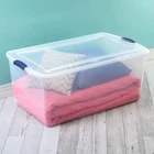 Product details Step up to versatile 105 Quart Clear Latching Storage Bin and get organized! The clear base and lid let you easily view and locate stored contents from any angle. The color accent latches keep the lid attached to the base, to keep items contained. The recessed lids help bins stack to efficiently use vertical space. This large size plastic storage container is perfect for organizing bedding, blankets, seasonal clothing, sports gear, décor, and other bulky items. This is the ideal solution for a variety of storage challenges, helping to bring order to closets, bedrooms, craft rooms, and dorms! 105 Quart Latch Box, Clear Plastic Storage Bin with Lid, Blue Latch Outside Dimensions: 32 1/8" x 19 1/8" x 13 3/4" Interior Dimensions at bottom: 27 1/8" x 16 1/8" x 12 7/8" Clear lid and base for easy identification of contents from any angle Color accent latches keep lid secure and contents in place The large capacity is a popular solution, allowing bulky and/or multiple items to be stored away in one convenient location Recessed lids allow bins to stack neatly, maximizing vertical storage space Use good judgment when stacking items, keep heaviest bin at the bottom BPA-free and phthalate-free Specifications Recommended Use Blanket Storage, Clothing Storage, Keepsake Storage Recommended Room Living Room, Home Office Material Plastic Color Blue Finish Stadium Blue Number of Compartments 1 Count 1 Volume Capacity 105 qt Shape Rectangle Has Lid Y Features Carrying Handles, Stackable Cleaning, Care & Maintenance Easy to clean, wipe with damp cloth Pattern Blue Age Group Adult Assembled Product Weight 6.22 lb Maximum Load Weight 1 lb Size 105 qt Assembled Product Dimensions (L x W x H) 32.13 x 19.13 x 13.75 in