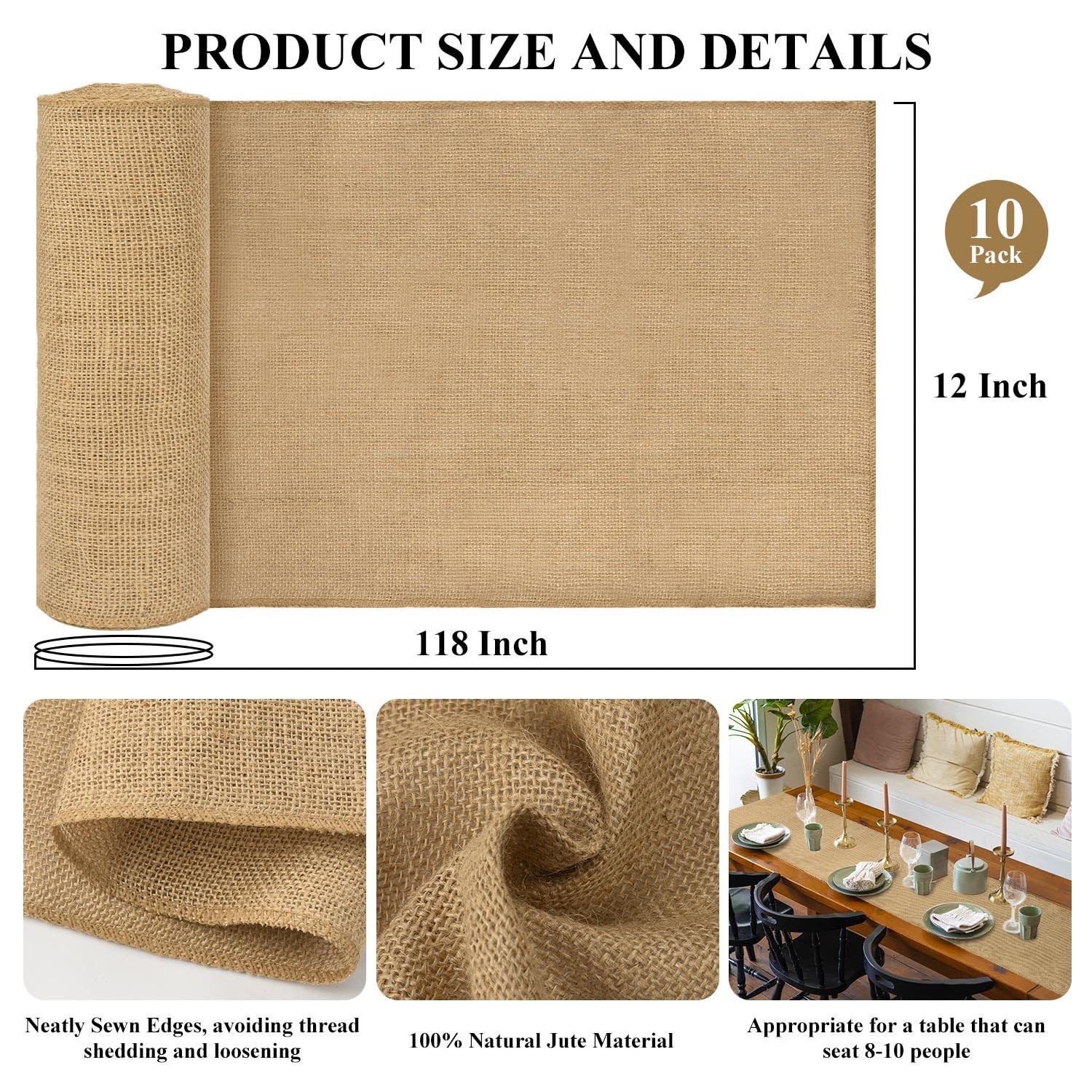 Burlap table runner is produced from natural jute fiber. The finished product will have the residual odor in the production process and the natural odor of the jute fiber itself. This odor comes from the properties of the product itself. Please do not use machine washing to remove odors, machine washing will damage the product's fiber structure and yarn layout. If the smell of the product is unacceptable, please unfold the product and place it in a ventilated place for 48-72 hours SIMPLE AND WARM DECOR: The burlap table roll has a unique Bohemian and farmhouse style, making it a great home decoration for anyone who enjoys simple decoration. You can decorate these hessian rolls on the dining table, desk, bedside, kitchen, and fireplace to create a warm environment GOOD SIZE FOR TABLES: Rustic burlap table runner has a size of 12x118 inches, suitable for tables that can accommodate 8-10 people. Adequate length is the perfect decoration for any special occasion or activity table. You can also freely cut these linen rolls until they fit the length of your desk BURLAP MATERIAL: Our burlap table runners are made of carefully selected coarse jute materials with exquisite locking technology, and can maintain this state for many years in various future activities and occasions WEDDING AND CRAFT ITEMS: These burlap runners lay on the table or serve as a backdrop for simple and rustic weddings and events as excellent decorative items; It can also be used as a linen ribbon for packaging; Or wrap your plants, potted plants, or trees in linen rolls to bring them a warm winter AFFORDABLE BURLAP ROLL SET: You will receive 10 new burlap decorations, with enough length to meet your daily needs. These hessian fabrics have the unique odor of jute. If you don't like them, please let the hessian rolls air for a period of time before use