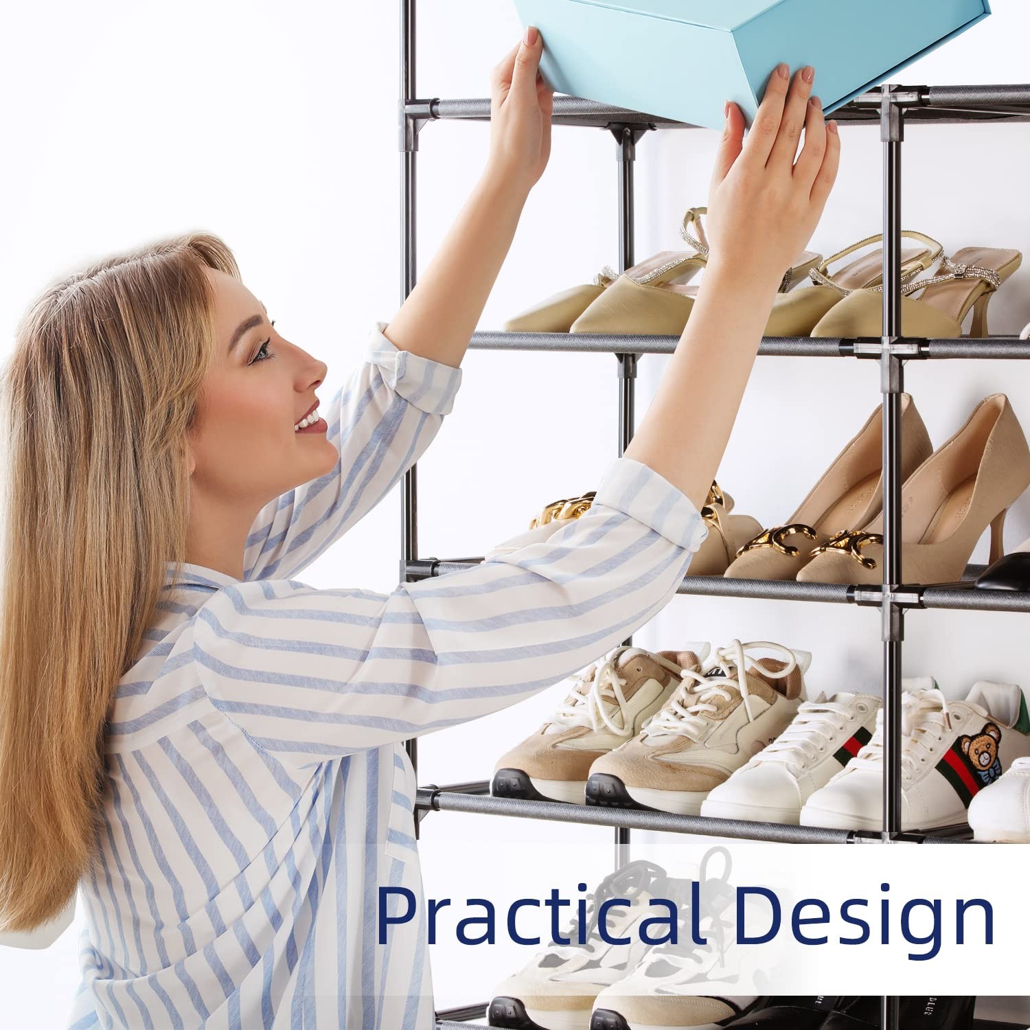 The flexible and unique design of this 10 Tiers Shoe Rack can satisfy your various requirement of storage in the daily life. It is really a powerful product to make your living space more comfortable and tidy, so that you should enjoy your better life at home. SPECIFICATIONS: - Color: Black - Material: High-quality PP Connectors, Waterproof Fabric Tiers, Durable Iron Pipes - Layer Height: 6.7" - Assembly Required: Yes - Product Size: 34.64" x 11.41" x 68.9" - Weight: 6.5lb Package Contents: - 1 x 10-Tier Shoe Rack - 1 x Instruction NOTES: - Please follow the instruction when assembling. - Please Keep out of the sun to prevent the fabric from deteriorating and to prolong its life. MANUFACTURER: is an American registered home furnishing brand, which means Home and You. Our company is committed to a variety of practical economic products that provide home storage solutions, simple, fashionable, innovative and environmental protection, to give you a more comfortable space, is our ultimate goal to create all products! Thank you very much for choosing , believe me, after purchasing, our story has just begun! 【10 Tier Tall Shoe Rack】The 10 tier shoe organizer can store 30 to 40 pairs of adult shoes. This shoe shelf is not only suitable for shoes, but also for bags, toys, towels, sundries, books, plants and small accessories. 【Sturdy Large Shoe Rack】The large shoe rack has a support layer in the middle of it, It enhances the stability of the shoe shelf while meeting the need for large capacity. The shoe rack for closet can hold larger and heavier shoes or objects. 【High-quality Shoe Rack】The shoe storage is made of sturdy steel pipes, reinforced PP connectors and durable waterproof non-woven fabric layers. The shoe rack organizer has the characteristics of firmness, stability, adjustability and long service life. 【Size and Function】Shoe rack size:34.64"x11.41"x68.9".The shoe rack shelf can help you store 30 - 40 pairs of shoes and save space more effectively. It is suitable not only for those who have a large number of shoes but also for those who have lots of books and sundries. The tall shoe shelf can make the limited spaces such as closets, entryways, dorm rooms, apartments, hallways. 【Easy to Assemble】The shoe rack can be easily installed by one person. No tools required, just connect the plastic connectors to complete the installation. You can remove one layer to store boots, high heels or other larger accessories. This shoe organizer can split into 3-tier, 5-tier or narrow shoe racks to suit different rooms. 【Worry-free Service】Any quality and assembly problems with our 10 tier shoe rack after purchase, please feel free to contact after-sales service. 【Usage Guidelines】When installing the shoe shelves, please make sure the plastic connectors are mounted in the right directions, the steel tubes and plastic connectors are securely connected.