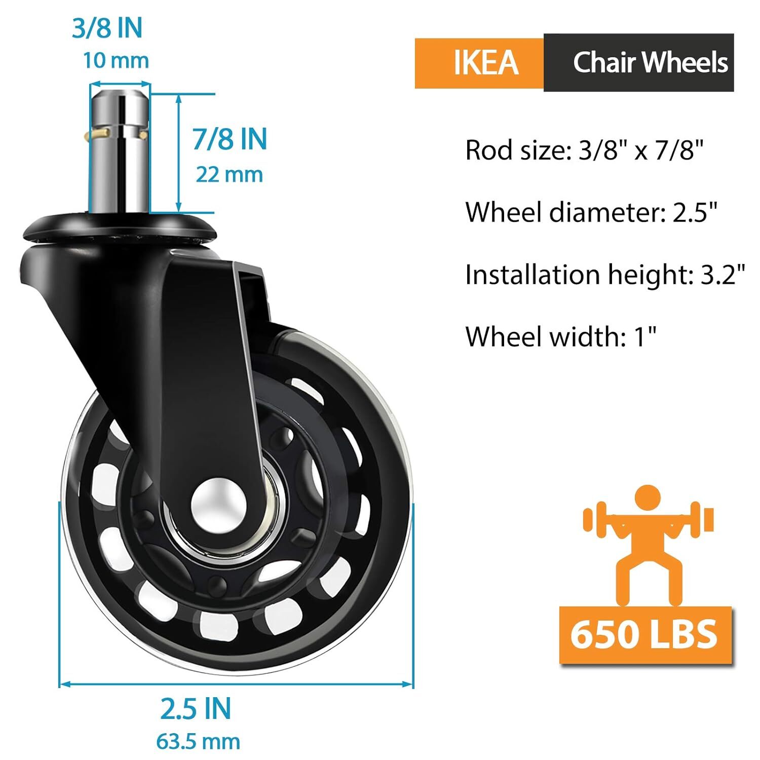 Office Chair Wheels 10mm Stem-ONLY Compatible with IKEA Chairs (Set of Marble Product Details Package Dimensions : 7.99 x 5 x 3.74 inches; 2.25 Pounds Item model number : IKEA Office Chair Wheels Manufacturer : LONGADS Color: Marble Brand: LONGADS Material: Polyurethane Mounting Type: Stem Mount Load Capacity: 650 pound 【PROTECT FLOORS】chair wheels soft polyurethane material increases the grip of the floor without leaving scratches on the floor. It can protect your floor from damage without tangling wires, plush carpets and hair. Suitable for all types of floors -Hard floors, tiles, marble, laminate or short-haired carpets. 【CONVENIENT INSTALLATION】 office chair wheels upgrade tchnology, caster stem diameter 3/8 inches (10 mm), stem length 7/8 inches (22 mm) (important: ONLY compatible with IKEA office chairs), just Pull out the old plastic office casters, and then push in the new high-quality replacement casters, you can quickly and easily install, so that the chair looks novel and fashionable 【STABLE AND QUIET】The wheels of office chairs are smoother than plastic wheels. Using high-precision double bearings, it can rotate 360 degrees smoothly, without any external force, and does not produce any noise, saving the office time for transferring files. 【STRONG AND STURDY】 office chair wheels technology, industrial solid steel bars and wheel frames to make the wheels stronger. A set of 5 wheels can support the weight of 650LBS, so your weight is no longer a problem. This is a great gift for employees and colleagues. 【Note】If you have any questions after purchase, please feel free to give us feedback. Not only will you get a set of affordable and tough office chair wheels, our team will also provide you with meticulous service.