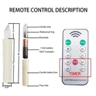 Color:10pcs,wram White Lights Description: These flameless candles can be used indoors or outdoors. Enjoy the mood without the messy wax and dangerous flames as well as the convenience of the remote control and timer. The bulbs are made in LED, which is safe and energy-efficient and they change colors, too. This is perfect for those nights when you want to relax and de-stress. Give you the feeling of real candles without worrying about dripping, fires, etc. Specification ●Material: Plastic and ABS ● Flash mode: Flicker Flame ● Work time: 140 hours ●LED color: Warm White Flicker ●Battery: 1xAA batteries (not included) ●Remote battery: 1-CR2025 (included) ●Diameter: 0.7 inches ●Length: 4 inches Details 1. On1/ON2 and Off buttons: Press "ON1/ON2" /"OFF" button to turn the candle on /off. 2. Press "On1", the candle is flickering, the color changing,and it will be stopped after continuously pressing "On1" three seconds. 3. Press "On2", the candle is not flickering, the color changing, then press"SL" makes the candle flicker, it can be stopped after press "On2" again. 4."+": Press it makes the light brighter 5."-": Press it makes the light darker 6."SL": Press it makes the light slow flickering 7."FL": Press it makes the light fast flickering Package includes: 10 x Flameless Candles (batteries not included), 1 x remote control (battery included), 10 x clips 【LONG LASTING/SAVE BATTERY】 Each candle requires 1x AA replaceable batteries(NOT included) that will provide up to 180 hours(10-15 days) light-time and can be replaced easily.It saves your money on batteries. A great way to enjoy the gorgeous candlelight. 【REMOTE CONTROL/DIMMABLE AND FLICKERING】 THE Candles have a Flicker(Fast and Slow) and You can control the Brightness(Increase and Decrease) by the remote.Candle gives you a REALISTIC APPEARANCE without the smoke,fake scent or messy dripping wax! 【PERFECT for DECORATION】 These battery operated led Christmas candles light can be used to create a joyful and festive ambience. They are perfect for home, Christmas parties, holidays, Thanksgiving, Harry Potter themed parties, indoor and outdoor decorations. 【WIDELY USE with HIGH QUALITY CLIPS】The candles come with removable clips for each which can attach them to a Christmas tree,Chandeliers,Swedish Candelabra, wreaths,tealight or other object.They can be widely applied to Christmas, wedding, party, thanksgiving. 【SAFE and BEAUTIFUL】 The candles are Energy saving, smoke free, zero carbon emission and without having to worry of flame. Absolutely no fire hazards or burning risks, safe for families with pets or young children.They can create warm and romantic atmosphere, which can give you a magic world, and bring a breathable design into your home's warm environment.