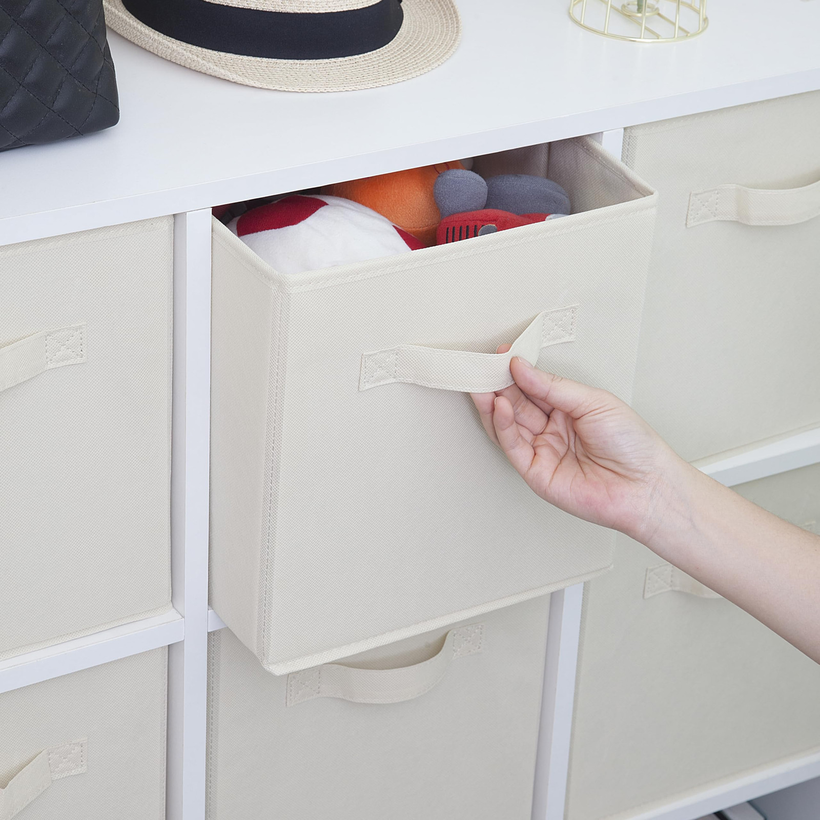 These storage cubes are game-changers for keeping things neat! The perfect 11-inch fit slides right into shelves, and the soft fabric feels durable. I love the handles—so easy to pull in and out—and the neutral beige blends anywhere. Used them for kids' toys, sweaters, and even pantry snacks. They fold flat when not needed, saving space. Super versatile and sturdy—highly recommend!