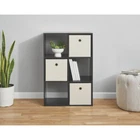 Product details The 6-Cube Storage Organizer features six compartments perfectly sized for storing and displaying office supplies, books, clothes, craft supplies, photos, collectibles and so much more! This sturdy bookcase can stand vertically or horizontally to best suit your needs and space. They are compatible with 10.5" x 10.5" collapsible storage bins (sold separately) and available in multiple finishes. Three open-back cube shelves make managing cords and cables easy, while three closed-back shelves help keep items securely housed. Add an accent piece that is both functional and stylish to your living room, family room, home office, playroom, closet and more, with the 6-Cube Storage Organizer. Stylish 6-cube organizer bookcase Features six 11" x 11" x 11" open storage compartments Can be used vertically or horizontally to fit your space and needs Designed with 3 open-back shelves and 3 closed-back cube shelves Top panel and 2 middle shelves support up to 22 lbs each; bottom panel supports up to 33 lbs Compatible with 10.5" x 10.5" collapsible storage bins (sold separately) Perfect for use in dens, living rooms, family rooms, playrooms, home offices and more Materials: particle board, paperboard Finishes available: White (MS5336278612010), Black (MS5336278612009), Canyon Walnut (MS18-D1-1009-49) and Rustic Brown (MS18-D1-1009-48) Attaches to the wall with included hardware for safety Easy to assemble with included instructions and assembly video guide (hammer & Phillips head screwdriver required) Package size: 39.53" x 4.17" x 15.28" (32.81 lbs) Assembled weight: 32.5 lbs Assembled dimensions: 23.7" W x 11.73" D x 35.39" H