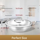 12INCH Tri-Ply Stainless Steel 5 QT Wok Pan with Lid, Induction pan,suate pan,deep frying pan,dishwasher and Oven Safe Tri-Ply Clad:Made with a responsive aluminum core bonded together with 2 layers of durable, stainless steel all the way around for maximum durability and fast, even heat distribution. Food Stainless Steel:Highly polished food stainless-steel cooking surface with starburst finish offers superior stick resistance and easy maintenance, plus won’t react with food. Cool Touch Double Handles: Secured with double side stainless-steel handles to ensure a safe grip and balance while providing cool touch handles. Suitable for All Stoves:Works on all cook stovetops, include induction. The high quality stainless steels and the aluminum core make it dishwasher-safe and oven-safe up to 500°F. Your Reliable Partner:All the Cookware from in PFOA-Free,SGS Certified. Each pan and pot from heats quickly and spreads heat evenly because of our High-Control level of materials.