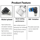 Type:1/4 Od x 1/2" Npt Thread Push to Connect Fittings; Body Style: male 90°Degree Elbow ;Made of quality plastic and stainless steel; corrosion resistance, ductility 1/4 Od Air Fittings Fluid Admitted: Air, Water (No Freezing); Applicable: Pipe PU/ PA/ PE/ PVC; Working Temperature: 0-60°C | 32~140°F;Working Pressure:0-1.0mpa | 0-150psi; Proof Pressure:3.0Mpa | 435psi; Negative Pressure:-100Kpa | -29.5 In Hg The 1/2 Airline Push fittings are available in various styles and models ,All models of push in connectors are designed to suit your pneumatic piping needs perfectly Easy to install to 1/4 OD tubing and removed, even can change the tube connector direction after installation easily,360-degree rotate freely The release ring of Pneumatic Air Tube 1/4 od Fittings conforms with the ellipse design to ensure that the disconnecting unit is in good shape;offering good seal property