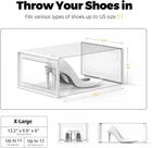 📦 12/24 Pack XL Clear Drop Side Shoe Boxes – Stackable Sneaker Display Case Upgrade your closet and sneaker storage with these XL clear drop side shoe boxes. Designed for sneaker lovers and anyone who needs clean, organized storage, these stackable display cases offer durability, space-saving design, and easy access. Whether you’re storing everyday shoes or displaying your favorite sneaker collection, this set is the perfect solution. ✨ Features & Benefits 🔍 XL Size – Fits Up to Men’s Size 11 Shoes Spacious interior designed to hold large sneakers, high-top shoes, heels, sandals, boots and more. Perfect for sneaker collectors. 👉 Drop Side Door – Easy Access The right-side drop-down door lets you open the box easily without unstacking. Convenient for daily use and prevents wear on shoes caused by friction. 🧱 Stackable & Secure with Locking Clips Built-in stacking design allows you to stack multiple layers safely. Locking clips keep boxes firmly in place — no tipping, sliding, or collapsing. Great for: ✔ Closets ✔ Entryways ✔ Under the bed ✔ Shoe walls ✔ Storage rooms 🌟 Clear Display – Show Off Your Collection Crystal-clear front and sides make it easy to see your shoes at a glance. Perfect for sneakerheads who love showcasing their collection. 🛠 Durable & Ventilated Made from strong, thick plastic that keeps its shape. Ventilation holes help keep shoes fresh and prevent odors. 🧺 Space-Saving Organization Transforms cluttered closets into clean, neat storage. Ideal for shoes, accessories, toys, tools, and other household items. 📦 What You Will Receive 12-Pack / 24-Pack XL Drop Side Shoe Boxes Color: Black or White with Clear Front Fits up to US Men’s Size 11 Includes: Locking Clips + Front-Open Doors 🎁 Perfect For Sneaker collectors Families needing better shoe storage Closet organization Entryway storage Gifts for sneaker lovers ❓ Frequently Asked Questions Q: Can these be stacked high? Yes! They are designed to stack securely with locking clips. Q: What shoe sizes fit? Up to Men’s Size 11 (most styles). Q: Does the door open from the front or side? The door opens from the Front ,right side. Q: Are they clear? Yes, the front panel is fully clear for easy viewing. 📌 Buy with Confidence Fast shipping, secure packaging, and customer-friendly service. Keep your shoes clean, organized, and beautifully displayed! Previous page Now with handle Visit the Store Next page Product description Previous page Next page Under the Closet On the Entrance Not Only for Shoes Stackable Water-proof Transparency Ventilation