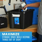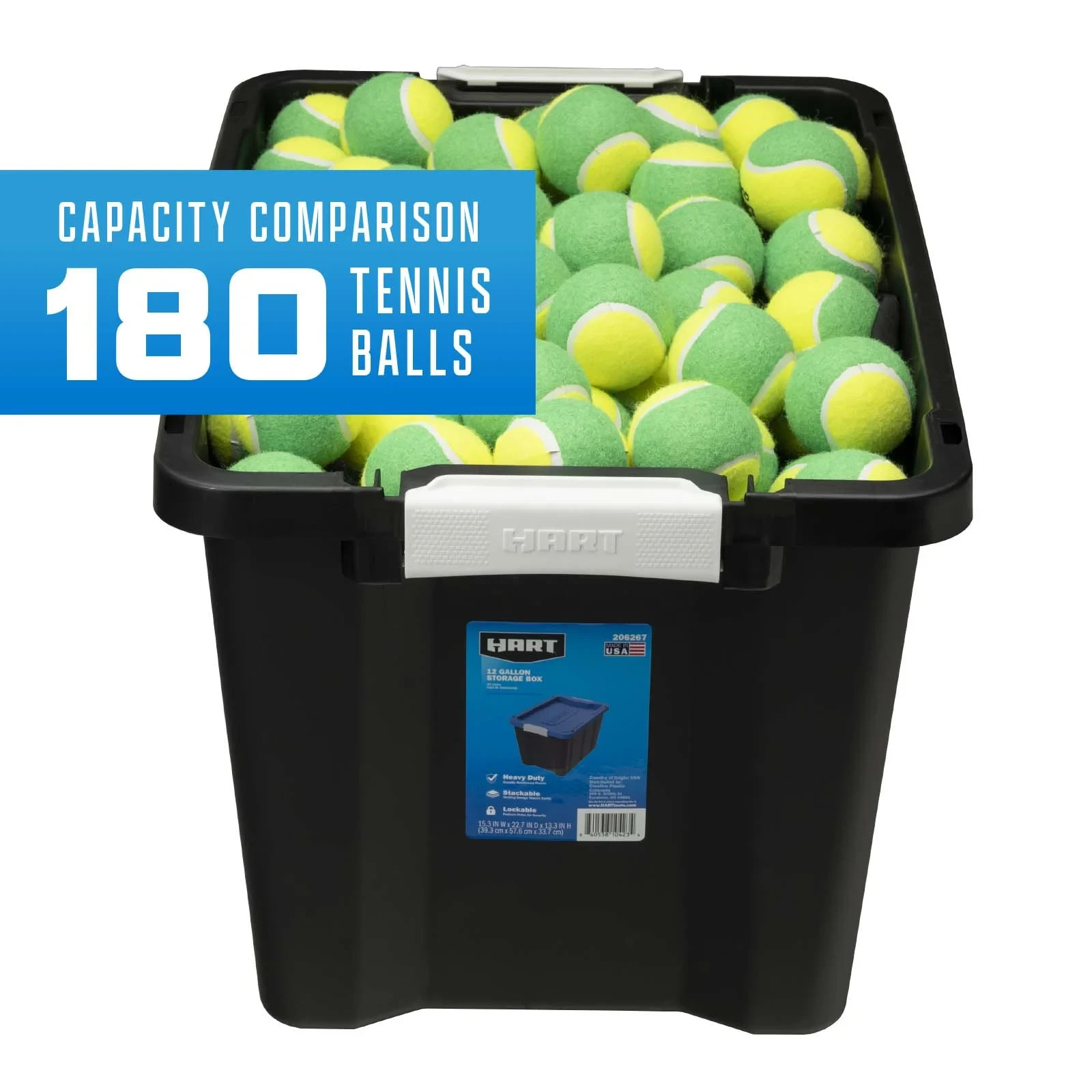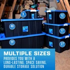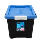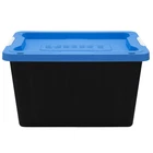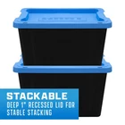 Product details The set of 4, HART 12 gallon plastic storage tote has a black base and blue lid and provides you with an easy storage and organization solution to reduce clutter and increase space in your home. Made of extremely durable plastic (polypropylene), the strong rigid walls of the storage tote are stackable to maximize storage space and to stay sturdy when stacked. The recessed lid design helps keep totes secure and prevents sliding or tipping. The two latch grip handles make it easy to transport or use for moving valuable around. The compact 12-gallon size is great when needing to store heavier items or on higher shelfs. For added measure, the storage tote includes 4 large holes around the edge to keep items safe using zip-ties or padlocks. Tough plastic construction resists rust, dents, stains and peeling to ensure lasting use while protecting against pest, dust, pollen, and weather Recessed lid design creates stability and reduce toppling when multiple units are stacked Latching Handles – Easy to open and close 2-point grip latch handles keep your items safes from spilling or falling out Lockable Lid comes with 4 holes ideal for zip-ties or large enough for padlocks to keep your items safe and secure Exterior Dimensions-22.7 IN W x 15.4 IN D x 13.3 IN H OR (57.6 cm x 39.1 cm x 33.7 cm) Easy to clean surface, Indoor or Outdoor use Sustainable-Made from recycled materials Set of 4 -Includes 4 black base and 4 blue lid Storage Ideas: Gardening supplies, Pet treats and supplies, Cleaning and household products, Holiday and seasonal items, Linens, Clothing, Shoes, Handbags, Toys, Games, Arts and Crafting supplies, Kitchen items that are easily breakable, Underneath cabinets, In smaller or hard to reach space like attics, basement, and pantries.
