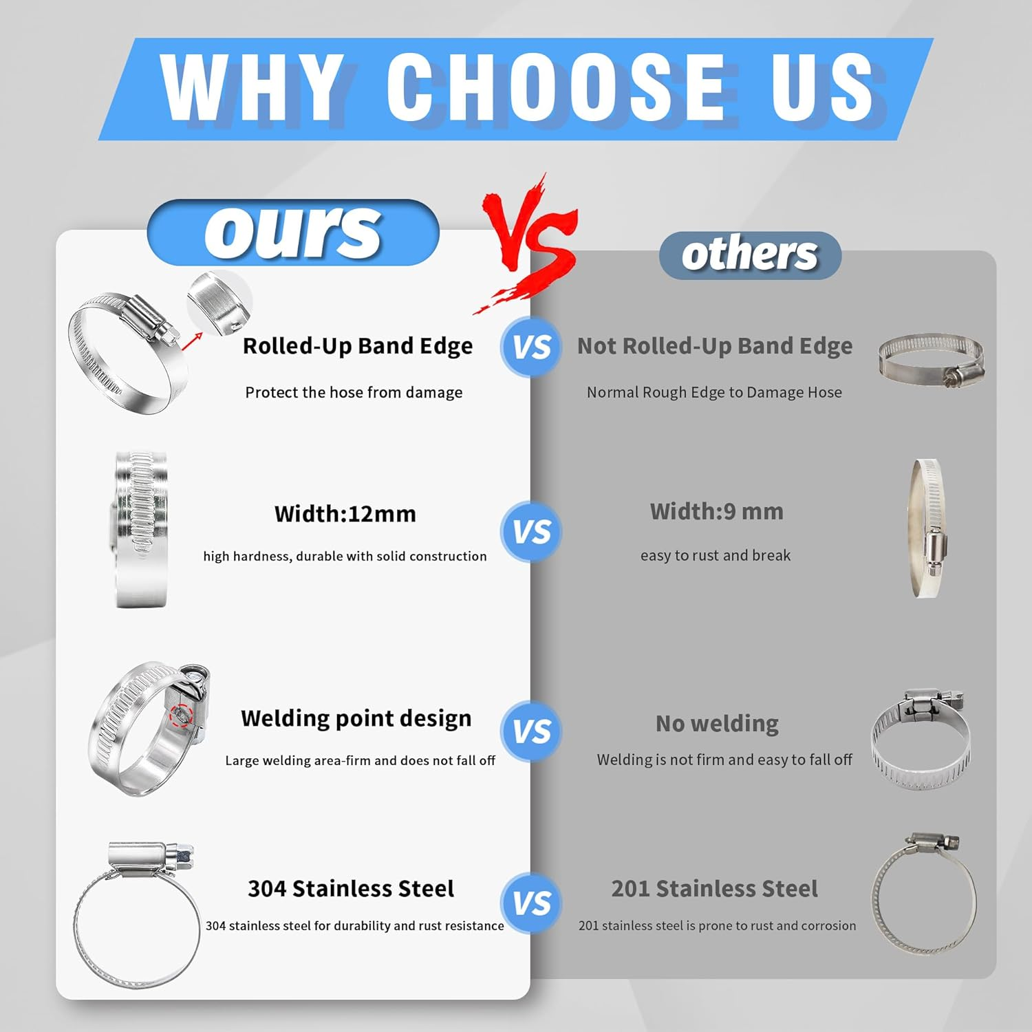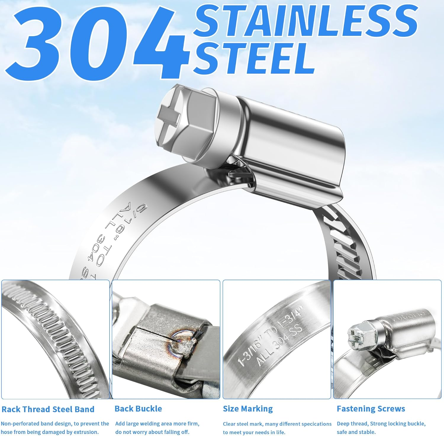 Store New Arrivals Add to Favorite View Feedback 12PCS Heavy Duty Hose Clamps Stainless Steel 304,1-3/16" Hose Clamp to 1-3/4" Hose Clamp in (30-45Mm) Adjustable Worm Gear Drive Hose Clamps, Reusable Pipe Clamp for Garden, Automotive Description Item model number PEROMI-HC Item Package Quantity 12 Style Heavy Duty Hose Clamps Color 304 Stainless Steel Brand PEROMI Material Stainless Steel Batteries Required? No Item Weight 9.1 ounces Batteries Included? No Size 1-3/16" hose clamp to 1-3/4" hose clamp Package Dimensions 4.02 x 3.11 x 3.03 inches Manufacturer PEROMI [๐๐ข๐ณ๐ ๐๐๐ง๐ ๐ & ๐๐ฎ๐๐ง๐ญ๐ข๐ญ๐ฒ] Adjustable range of the hose clamps is 1-3/16 to 1-3/4"(12pcs), band width:12mm(0.5"), thickness:0.6mm(0.024"). Installation and removal are simple and convenient, and the size of the clamps can be adjusted according to the hose outside diameter. [๐๐๐ ๐๐ญ๐๐ข๐ง๐ฅ๐๐ฌ๐ฌ ๐๐ญ๐๐๐ฅ] These worm gear hose clamp is made of 304 stainless steel and have excellent corrosion resistance. They can resist the erosion of various chemicals, making them suitable for various industrial environments and harsh conditions, ensuring long-term stability of the pipeline system. [๐๐ญ๐ซ๐จ๐ง๐ ๐๐จ๐ง๐ง๐๐๐ญ๐ข๐จ๐ง ๐ ๐จ๐ซ๐๐] Our Stainless steel hose clamps feature a toothed screw-style band, providing a high tensile strength. Torque is also greater than common clamps, allowing them to withstand higher pressure and load. This prevents loosening and displacement of the connection, increasing safety and reliability. [๐๐ซ๐จ๐ญ๐๐๐ญ ๐๐จ๐ฎ๐ซ ๐๐จ๐ฌ๐] Band has rolled edges to prevent cutting damage to hoses, PVC pipes, and rubber pipes, which could lead to leaks. Our clamps are different from ordinary ones as they do not have perforations. This design prevents the hose from being damaged by squeezing through the holes in the band. [๐๐ข๐๐ ๐๐ฉ๐ฉ๐ฅ๐ข๐๐๐ญ๐ข๐จ๐ง] With strong connection force, easy and quick installation, high corrosion resistance, and good adjustability, Heavy duty hose clamps are widely used in ideal homes, automotive pipelines, general piping, ships, and industrial applications. pleas contect us if you have any questions about hose clamps. [๐ญ๐ก๐ ๐๐จ๐ข๐๐ ๐จ๐ ๐ญ๐ก๐ ๐๐ฎ๐ฌ๐ญ๐จ๐ฆ๐๐ซ] What is its secret? Adequate gauge and grade of metal, adequate lands on the clamping belt, and welding. In short, no real secret, just good engineering and a plan for repeat sales rather than a throwaway part. Product Description 304 Stainless Steel Adjustable Worm Gear Hose Clamps Enhance your plumbing, automotive, and industrial projects with our Peromi 304 Stainless Steel Adjustable Worm Gear Hose Clamps Designed for durability and versatility, these clamps range from 1/2" to 3/4" (13-19mm) and are made from top-quality 304 stainless steel, ensuring excellent corrosion resistance. The toothed screw-style band provides strong connection force, while the rolled edges protect your hoses from damage. Whether you're working on home repairs, automotive maintenance, or industrial applications, these clamps are a reliable and durable choice. Protect Your Hose 304 Stainless Steel Made from high-quality 304 stainless steel, these clamps offer superior corrosion resistance. Ideal for harsh industrial environments and chemical exposure, ensuring long-lasting performance. Strong Connection Force Equipped with a toothed screw-style band, these clamps provide exceptional tensile strength and torque. They can handle high pressure and loads, preventing loosening and displacement for enhanced safety and reliability. Protect Your Hose The band features rolled edges to prevent damage to hoses, PVC pipes, and rubber pipes. Unlike ordinary clamps, these do not have perforations, reducing the risk of leaks and damage. Wide adjustable size range Easy installation and removal with adjustable sizes to fit various hose diameters. Wide Application and Easy to Install Size Range & Quantity Perfect for home improvement, automotive, plumbing, marine, and industrial projects. Easy to install and highly adjustable, making them a versatile solution for various applications. ABOUT US We offer the best prices around on high quality products. Our E-store includes media such as books, movies, music and games while offering electronics, toys, sporting apparel, clothing, tools, general home, garden items and more. SHIPPING We are always working hard to ensure your package arrives as soon as possible. Please understand that some factors like weather, high postal traffic, and the performance of shipping companies are outside of our control. We offer free shipping to the lower 48 states and ship within 2 business days of payment, usually sooner. We do not accept P.O. Boxes. Please provide a physical address. RETURNS We offer a 30-Day Return Policy on items which you are not completely satisfied with. You have the option for a full-refund or an exchange of the item. No returns are available on items shipped outside of the USA. PAYMENT We accept PayPal. CONTACT US This page content is yet to come Please ad us to your favorite seller and visit again later Thank You