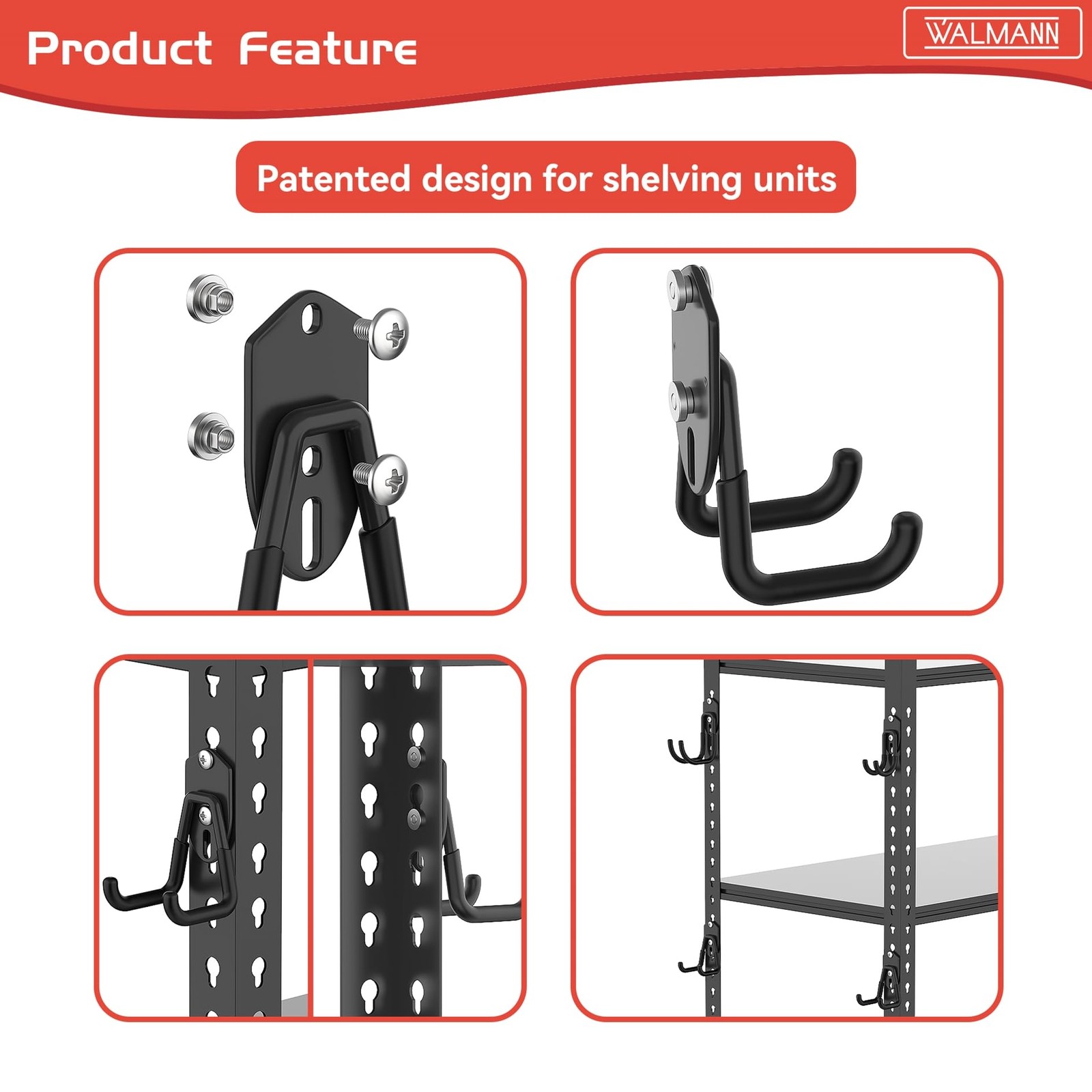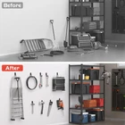 garage storage system hooks Reclaim Floor Space-Garage storage hooks are a great way to organize brooms, shovels, tools, and ladders in your garage. Get them up off the floor and onto shelves and walls to keep your space neat and clutter-free. You'll love having a place for everything. Wall Mount Hooks Compatible with Keyhole Shelves-Our utility hooks are specially designed to work for both wall mount and keyhole-style shelves(not for wall shelf types). Durable, Rubber-Coated Design-These heavy-duty hooks are built to last from thick, high quality steel. They feature 4 reinforced spot welds on each base plate for extra strength. The rubber-coated prongs protect both the hooks and your hanging items from scratches. Designed for durability and longevity. Easy Installation-Garage wall hooks install easily onto walls or keyhole shelving. Vertical screw holes allow attachment to wall studs, while hooks also can be easily attached to the keyhole slots(1.5" apart spacing) in the shelving unit legs. No special tools or hardware required - simply screw into place and organize your space. Risk-Free Purchase-We're confident you'll love these versatile storage hooks. If you're not 100% satisfied, just contact us and we'll make it right. Our hooks create handy extra storage on walls, shelving sides. The perfect solution for a tidy, organized garage. Why use shelving hooks? They allow you to utilize vertical space on shelves that would otherwise go unused. Unlike s-hooks, coat hangers, or cables, dedicated shelving hooks create an organized storage solution. You'll wish you had started using them years ago.