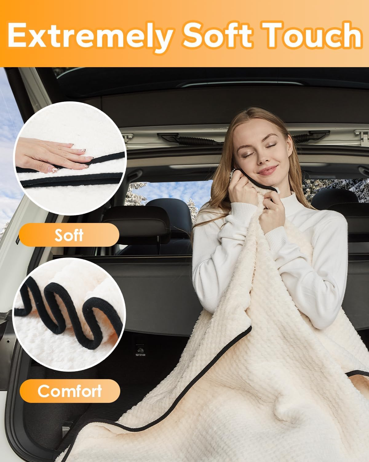 Portable Heated Blanket for Car: Package includes 1 plaid fleece heated car blanket, 1 12/24V car cigarette lighter plug, 1 clear storage bag, 1 sheepskin paper description, and providing portable warmth Suitable for 12V/24V cars: This heated blanket for car is not only suitable for all kinds of 12V small and medium-sized cars, but also can be used in 24V large trucks, you only need to plug it into your car cigarette lighter outlet, very suitable for car travel, camping, outdoor and other activities Fast heating: With advanced heating technology, this car blanket can quickly generate heat in less than five minutes, the highest temperature can reach 130°F, and with overcurrent, overvoltage and overheat protection, you can use it with confidence Three adjustment methods: three adjustable temperature modes, three timed off, you can adjust the temperature and time at any time to adjust your comfort, but also to avoid waste of energy Comfortable and lightweight: Made of high-quality 280g sherpa fleece, this car electric blanket is soft, holds heat well, folds easily and can be stored in the trunk or back seat of a car without taking up too much space. This blanket comes with a 96-inch detachable cord to keep you warm no matter where you sit in the car Machine Washable: The removable connector makes this heated car blanket easy to machine wash, making your cleaning easier. You just throw it in the washing machine, mind you, don't dry clean Product Description