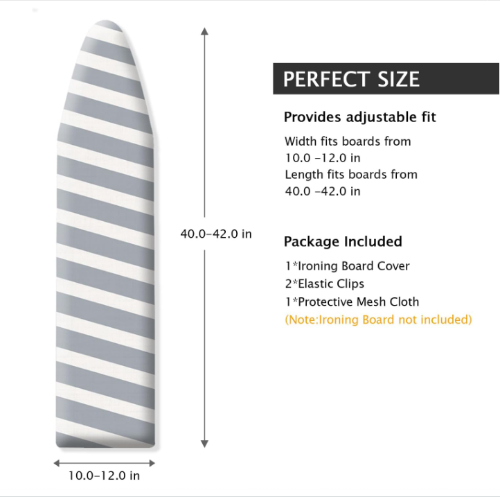 12X42 Inch Ironing Board Cover and Pad - 100% Cotton and Heavy-Duty Unable to find a right size cover? - This cover fits ironing board length from 41” to 43”,width from 11” to 13”. Designed specially for swivel hide away ironing boards and built in wall boards 12” x 42”. Custom fit provides a smooth ironing surface Sick and tired of inferior ironing board covers and pads? - The 100% cotton cover is strong and durable. Thick fiber pad makes ironing easy. 4-layer construction with silicone coating cotton surface resists scorching and staining. Includes soil release and water repellant treatment So awkward that the cover just never seem to fit right? - Elastic made to hold and endure the cover under the board without drawstring. Elastic fasteners to hold the cover even more (Optional). Iron’s Perfect Friend - Easy fit system allows to fit all different nose shapes. Tailored nose pocket,easy to install and well locked by the pocket and fasteners(optional) and elastic borders Still Not Convinced!? - If you have any questions,please tell us in time
