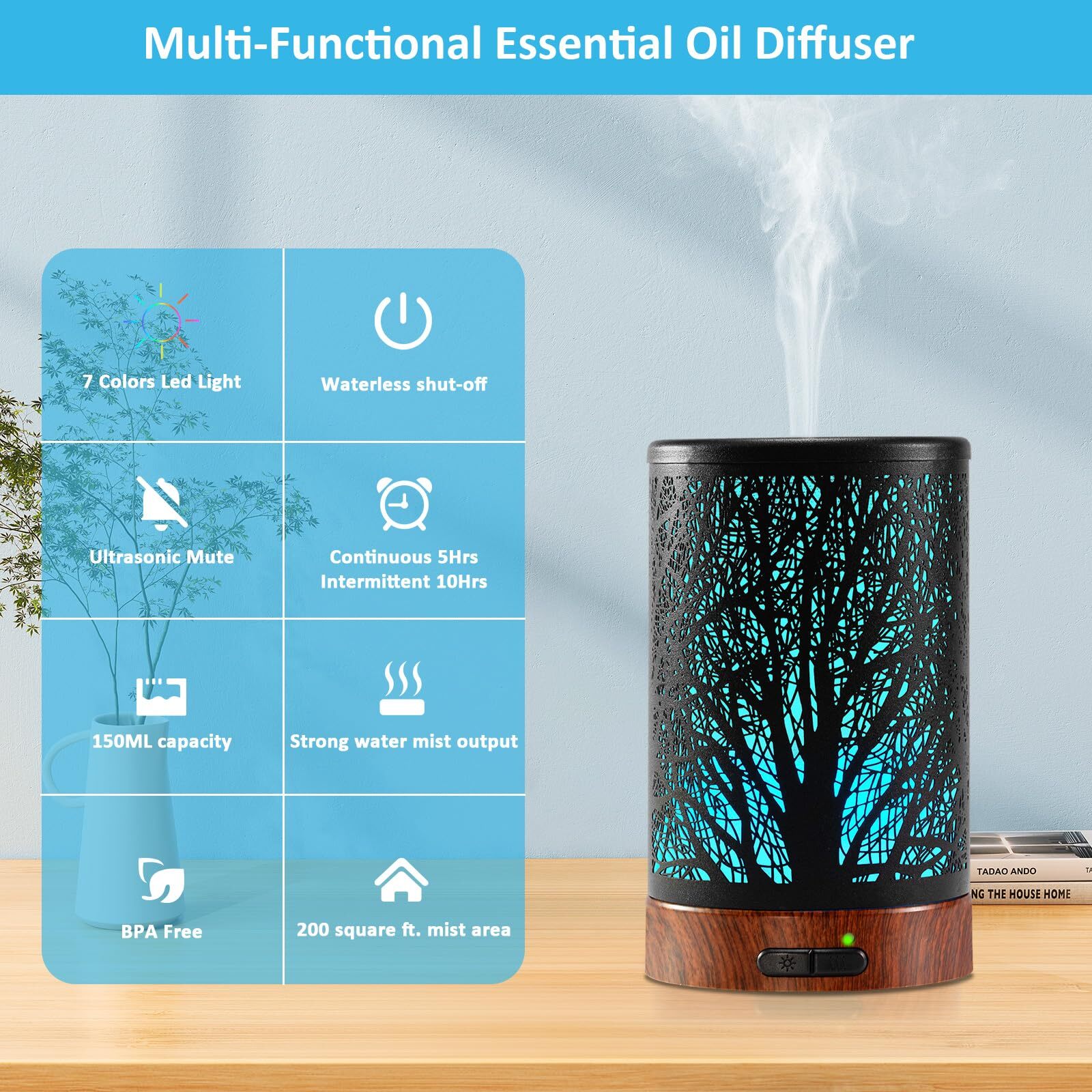 Essential Oil Diffuser - 150ML Metal Aromatherapy Diffuser for Essential Oils with 7 Colors Lights Gifts for Mom Waterless Auto Shut-Off & Ultrasonic Cool Mist Diffuser, Ambience for Home 4-IN-1 MULTI-FUNCTIONAL ESSENTIAL OIL DIFFUSER: Can be used as an oil diffuser, cold mist humidifier, color-changing night light, and is also a beautiful room decoration. Essential Oil Diffuser adopts a unique tree design, which creates an aesthetically pleasing and peaceful atmosphere under the light, and is ideal for purifying the air, humidifying the air, moisturizing the skin, and relieving stress. A great gift for friends and family on birthdays, Mother's Day SILENT OPERATION: Our aroma oil diffuser use advanced ultrasonic technology to ensure silent operation, you can use the diffusers for home in your bedroom, office or during yoga practice, allowing you to relax and unwind without interruption. Experience aromatherapy and enjoy a peaceful environment as the essential oils diffuser for home fills the air with a delightful scent CHANGEABLE 7 COLORS LED LIGHT: Our essential oil diffuser has 7 ambient light modes, you can set 7 colors cycle through or fixe on one color that you like, aromatherapy diffuser can be used as a night light to create a relaxing and romantic atmosphere WATERLESS AUTOMATIC SHUT-OFF: The diffusers for essential oils large room is easy to use, simply add water and a few drops of essential oil to the tank and sit back and enjoy the soothing aroma. The essential oils diffuser also has a waterless automatic shut-off function, so you can enjoy the diffuser for essential oils without having to worry about running out of water or causing any accidents. Made of safe materials, safe for children and pets 6-12 HOUR MISTING FOR LONG-LASTING USE: The scent diffusers for home, with its large 150 milligrams water tank, can still work for up to 6 hours in continuous misting mode and up to 12 hours in intermittent misting (30-second pause). You have complete control over the intensity and duration of the mist, ensuring a personalized aromatherapy experience with a soothing aroma Capacity: 150ml Power: 12 watts Material: metal Package Contents 1 x Oil Diffuser 150ml 1 x Power Adapter 1 x Instruction Manual Shipping We offer FREE shipping on all orders! We ship within Three business days of payment, usually sooner. We use a selection of shipping services such as UPS, FedEx, USPS etc. We only ship to the lower 48 states, no APO/FPO addresses or PO Boxes allowed. Local pickups and combined shipping options are not provided at this time. International buyers – please note: Import duties, taxes, and charges aren't included in the item price or postage cost. These charges are the buyer's responsibility. Please check with your country's customs office to determine what these additional costs will be prior to bidding or buying. Order Cancellation Policy * Order Cancellation Policy ** You can return a product for up to 30 days from the date you purchased it. 1. The seller reserves the right to cancel the special case only due to eBay cancellation fee. 2. The decision of seller is the final. 3. The seller will respond to the cancellation request within 2 business days. Please wait for the result of cancellation. 4. In case the cancellation is not completed by some reasons, the buyer can follow the options below to get the refund. 4.1 The buyer can reject the item when it arrives. 4.2 The buyer can send the item back to the seller within 30 days If the buyer receives item (USA Shipment ONLY). The seller will provide the FREE return label to the buyer when the buyer opens " Return Item" case on eBay by using the reason as "Change my mind" ONLY. 5. When buyer has placed the order. The order will be processed and completed by automatic warehouse system within 5 minutes. In case that buyer sends the cancellation request after 5 minutes of placing the order, the request will be rejected. **Sending direct message to cancel the order is not allowed for every case.* Return Policy - If buyer would like to return the items for refund or replacement, please CONTACT SELLER to receive the free return label from seller. The refund or replacement will be processed with the tracking number of return label which is provided by seller only. The other ways of return which are not approved by seller will not be processed for the refund or replacement. Return You can return a product for up to 30 days from the date you purchased it. Any product you return must be in the same condition you received it and in the original packaging. Please keep the receipt. Payment We accept payment by any of the following methods: eBay Payments Please pay as soon as possible after winning an auction, as that will allow us to post your item to you sooner! Feedback Customer satisfaction is very important to us. If you have any problem with your order, please contact us and we will do our best to make you satisfied. Contact Us If you have any queries, please contact us via ebay. We usually respond within 24 hours on weekdays. Please visit our eBay store to check out other items for sale! Thank you for shopping at our store.