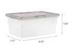 17 Qt. Plastic Storage Bins with Lids, Clear, Stackable Totes, Containers 8Pk About this item Clear Design: Transparent plastic allows for easy identification of contents without opening the lid. Secure Latching Lids: Each bin comes with a secure latching lid to keep contents safe from dust, dirt, and moisture. Stackable Design: Bins are designed to be stackable, maximizing vertical storage space and keeping areas organized. Durable Construction: Made from high-quality plastic for long-lasting durability and reliability. Modern Aesthetic: Clear material offers a sleek and modern look that blends seamlessly with any décor. Multipurpose Use: Perfect for storing seasonal clothing, holiday decorations, craft supplies, toys, tools, and more. Space Optimization: Stackable totes help you make the most out of limited storage space in closets, basements, and garages. Easy to Clean: Smooth surfaces make the bins easy to clean and maintain. Portable: Lightweight design with ergonomic handles for easy lifting and transporting between different storage areas or rooms. Highlight Volume Capacity:17 qt Material: Plastic Age group: Adult Color: Gray Assembled Product Weight: 1.053 lb Assembled Product Dimensions (L x W x H): 16.44 x 11.75 x 7.00 Inches