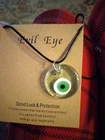 This 18" Evil Eye pendant necklace features a round charm design made of pink and green Bakelite. The necklace is on a chord with a lobster closure. Perfect for occasions like Mother's Day, Christmas, or birthdays, this unique piece by the brand Evil Eye offers luck and protection with its eye-catching colors and adjustable length.
