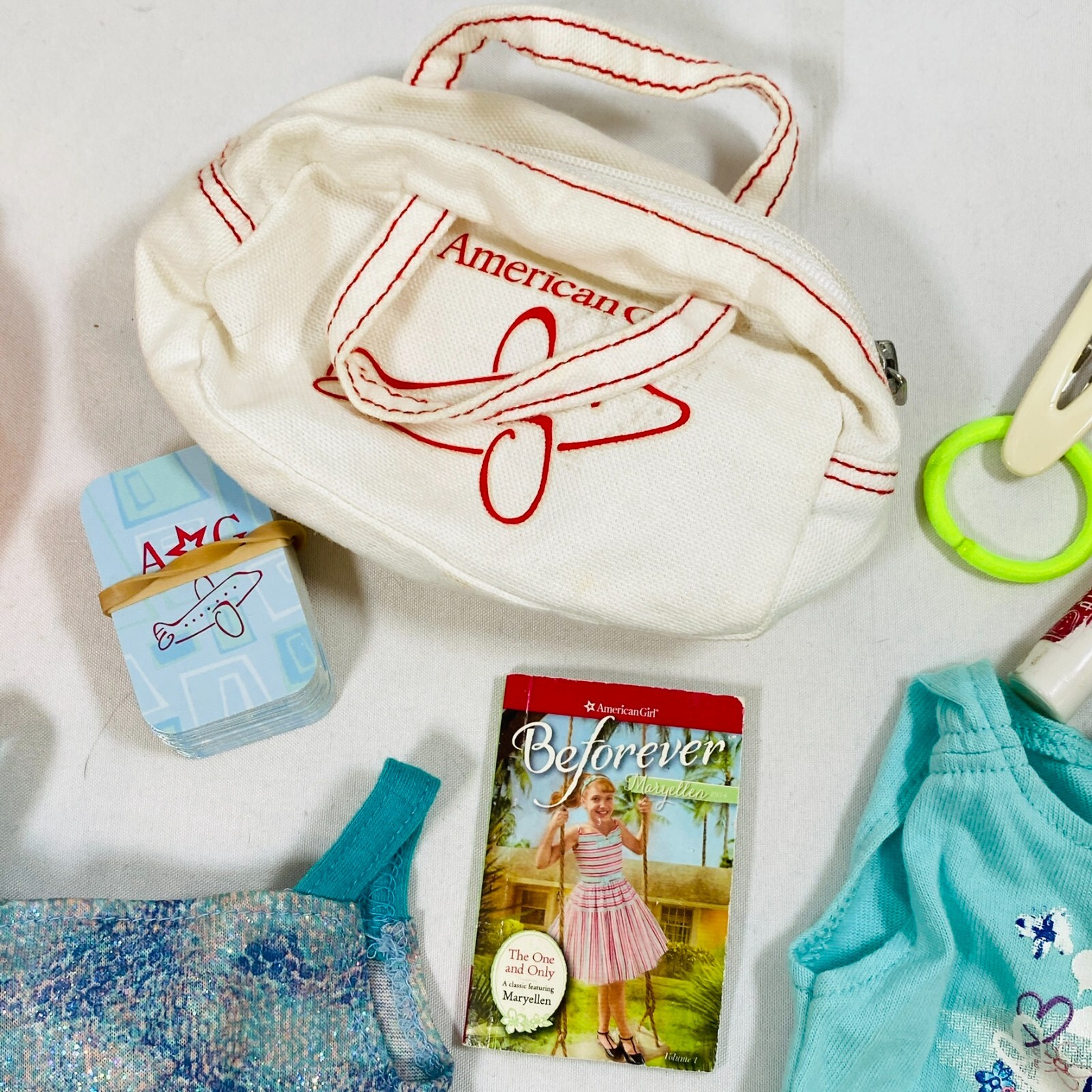 18" American Girl Doll Truly Me Mix & Match Set. Includes 2018 Blue Sea Dress, Side-Cinch Tank, Star Quilt Skirt, Travel Bag w/ Playing Cards & Hair Accessories, & OG Neck Pillow. In excellent condition, no flaws noted. Please see all pictures for exact cosmetic condition and other details, and ask any questions before purchasing. We are a husband and wife team with a growing family, and greatly appreciate your support of our small business. Please browse our eBay store for a variety of other American Girl items. We hope you enjoy this set!