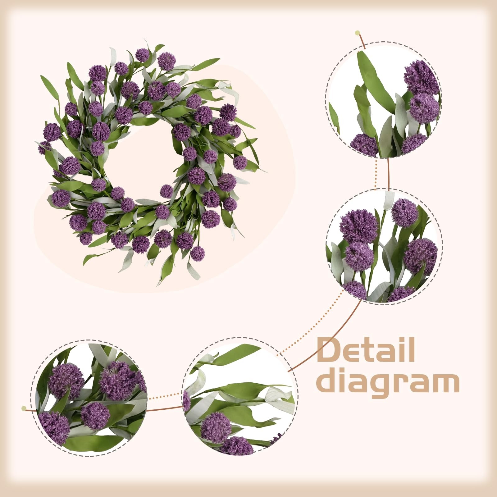 18-inch ball flower wreath, an excellent outdoor decoration designed for spring and summer, will fill your surroundings with vitality. It is suitable for use on front doors, walls, outdoors, indoors, windows, fireplaces, living rooms, porches, party center decorations, and weddings. The fresh and simple farmhouse style makes it suitable for most occasions. It is also perfect for all holidays such as Mother's Day, Easter, Valentine's Day, etc. 【Spring and Summer Front Door Wreath】: Skillfully combining vibrant ball flowers with slender willow leaves, this wreath is designed specifically for spring and summer outdoor decoration, bringing vitality to your surroundings. The full-bodied shape of the flowers adds depth to the wreath, enhancing its visual appeal. 【Size Information】: Our spring and summer wreaths have an outer diameter of approximately 18 inches. They are entirely handmade, featuring flexible and durable plastic materials for the leaves and flowers, which feel realistic and soft to the touch. The base is made of an iron ring, ensuring years of use without deformation. 【Multi-purpose Decoration】: Suitable for use on front doors, walls, outdoors, indoors, windows, fireplaces, living rooms, porches, party center decorations, and weddings. The fresh and simple farmhouse style makes it suitable for most occasions. It is also perfect for Mother's Day, Easter, Valentine's Day, and all other holidays. 【Slightly Fluffy】: The wreath may be slightly compressed during transportation, please reshape it before hanging. All branches are soft and flexible, allowing you to easily adjust the shape of the wreath to make it full and round. 【Maintenance-free】: It requires no watering or maintenance to stay bright, colorfast, and durable. Every detail of the exquisite wreath is carefully handmade, and the flowers and leaves will not easily fall off. It is not only a beautiful summer door wreath but also of high quality.