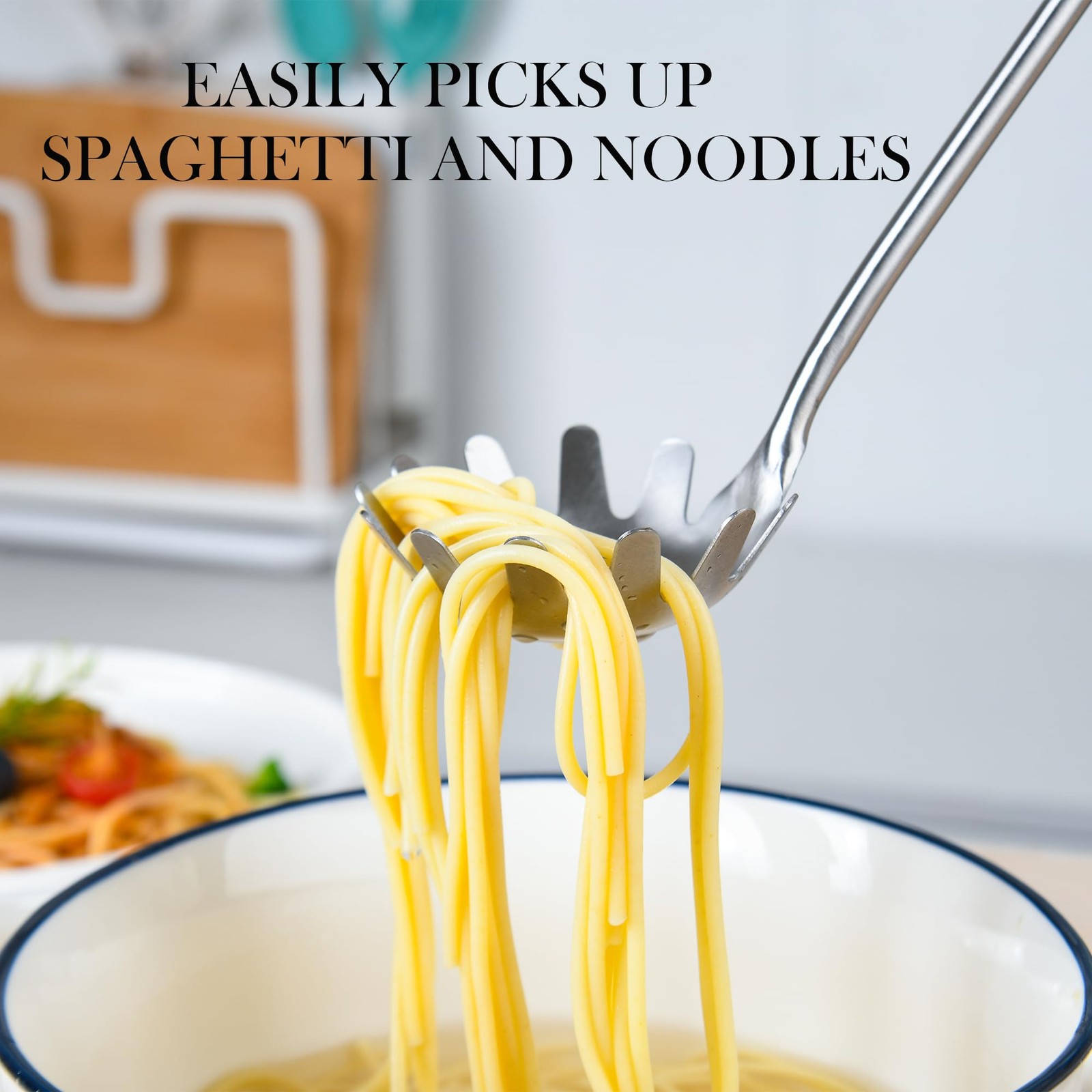 This 18/8 Stainless Steel Pasta Server Set is a must-have tool for every home chef, designed for cooking and serving delicious dishes such as pasta, stews, gravies, etc. The set includes a 13-inch pasta spoon , a 10-inch gravy spoon , and a tined pasta fork , each of which is made of high-quality 18/8 stainless steel material to ensure durability, rust resistance, non-toxicity and safe use. Features: High-quality stainless steel material : Each kitchen tool is made of 18/8 stainless steel , which is corrosion-resistant, anti-oxidation and durable, ensuring that you can use it for a long time without fading or rusting. Well-designed multi-functional tool : Pasta Spoon (13 inches) : Perfect spoon shape, can easily pick up pasta from the pot and avoid food spilling. Toothed pasta fork : The toothed design makes it easier to grab pasta, mix it, and serve it. Gravy Ladle (10") : Deep-mouthed, perfect for pouring rich gravy or sauce over pasta or stew. Comfortable grip design : The handle design of each tool is ergonomic, comfortable to use, non-slip and safer. Dishwasher safe : All tools can be put into the dishwasher for cleaning, which is convenient and fast, saving your precious time. Stylish and simple appearance : The stainless steel luster and modern design add beauty to the kitchen and also facilitate daily cleaning. Applicable scenarios: Home Kitchen : Ideal for everyday home cooking of pasta, stews, soups and sauces. Parties and Gatherings : Add style to your table and provide a perfect serving experience. Restaurant or café : essential high-quality tools in commercial kitchens to help chefs serve dishes efficiently. Specifications: Material : 18/8 stainless steel size : Pasta Spoon: 13 inches Gravy spoon: 10 inches Pasta Fork: Standard Size, with Teeth Color : Silver Gloss Cleaning method : Dishwasher safe, hand wash is also possible Includes 1 Pasta Fork(13.3”L×3.3”W)和1 Soup Ladle(10.6”L×2.5”W).Made of food-grade 18/8 stainless steel, it is corrosion-resistant and anti-oxidation. It can be used every day The stainless steel pasta strainer is multi-functional, featuring teethed head design which allows you to pick up noodles and spaghetti easily and securely without any of it falling onto floor. Long enough handle can also efficiently prevent burns to your hands when cooking pasta The spaghetti server spoon fork is ideal for serving pasta, spaghetti, noodles, can help you quickly pick up noodles and scoop more pasta, which are practical tools for parties, dinner, afternoon tea, wedding celebrations or daily use for home, hotel and restaurant The ladle spoon is suitable for scooping soup, gravy, sauce, broth, salad dressing, hot pot, rice noodles, clear soup, and other foods to meet your different cooking needs Dishwasher safe for easy cleanup