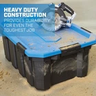 18 Gallon Heavy Duty Water Resistant IP65 Certified Latching Storage Bin, Black Base with Blue Lid provides the ultimate in garage storage. This storage tote brings peace of mind when having to store expensive items such as power tools, lasers, or delicate items that must be kept dry. This water resistant and dust proof storage container has a specially designed gasket lid along with 6 extra strong black latches to keep everything dry and clean. The gasket seal in the lid will stay in place to keep the lid tight and in place. A deep recess lid for maximum vertical storage and reduces toppling when stacked. Made for any on-the-go occasion, the tie down grooves provides extra security when placed in the back of a truck or a trailer hitch and used with tie down straps. The durable makes this storage bin long lasting and easy to clean. The IP65 Storage tote comes in both an 18 Gallon and 24 Gallon size with an interchangeable lid that works on either size. The 18 Gallon and 24 Gallon storage containers also have the same width and length for effortless stacking. A perfect storage solution to help organize items for adults or kids. Build your perfect storage organization system with other sizes that are available, such as, 50 Gallon Latching Tote, 40 Gallon Latching Tote, 17 Gallon Latching Tote, 12 Gallon Latching Tote, 5 Gallon Latching Tote, and combine it with our storage shelves, available in 4-tiers or 5-tiers in a variety of widths and depths. Water resistant design protects contents from rain snow and sleet Holes for zip ties and locks to secure your items Tie down grooves keep the tote in place during transport Stackable design maximizes vertical storage space and prevents toppling Interchangeable lid compatible with both 18 Gallon and 24 Gallon totes WEATHERMAX® Gasket sealed lid ensures complete water resistant protection Heavy duty construction provides durability for tough jobs Reusable and recyclable for eco-friendly storage solutions