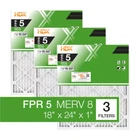 18X24X1 Pleated Air Filters Replacement For Furnace. AC HVAC MERV 8 FPR 5 3-Pack HDX filters are constructed of a durable, moisture-resistant frame with wire supported media for strength and rigidity. The wire-backed Pleated media offers a large surface area which increases the filter's dust-holding capacity and improves its efficiency. The air filter media can be charged electrostatically which means it attracts, captures and traps particles that would otherwise bypass the filter. The air filter's media is rated between a MERV 8 and 13, which is one component of the FPR Rating. FPR or the Filter Performance Rating, is composed of 4-measurements for classifying air filters. Every rating includes 4-elements: MERV rating, E1 efficiency, pressure drop and dust holding capacity. MERV stands for the Minimum Efficiency Reporting Value and measures how well a filter traps particles. The higher the rating, the few particles getting through. E1 efficiency explains how well it traps the smallest particles. Pressure drop measures how much energy the HVAC unit will use to force air through the filter. Dust holding capacity describes how much dust a filter will hold in its lifespan. HDX filters are easy to replace making change-outs quick and keeping indoor air quality at its optimal level while protecting your HVAC unit and allowing it to perform efficiently. HDX air filters capture and trap allergens, airborne contaminants and other particles Created to provide higher efficiency and better overall performance than standard pleated filters Works in furnaces, HVACs, wall vents and ceiling vents Item represents 3 filters that will last up to 3-month, per filter, in a typical household environment and can be reordered through our subscription service