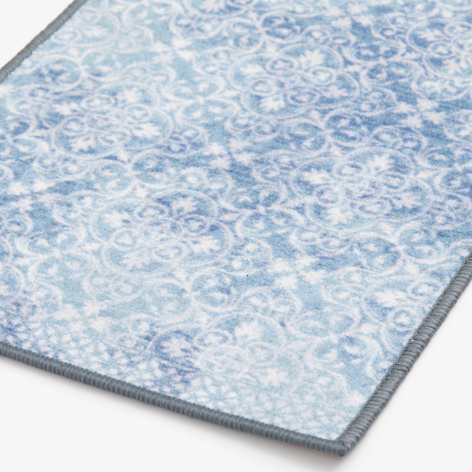 Add a touch of modern color and sophistication to your favorite interior spaces with this gorgeous 18" x 30" Teal Medallion Runner Area Rug. The beautifully intricate medallion and grid pattern, woven in vibrant teal, rich cobalt and crisp ivory, easily elevates any room for a touch of bright elegance. Made from low-profile printed loop pile nylon, the rug is durable and easy to clean, making it an easy way to add a touch of inspiration and style to any area of your home. From a busy, spill-prone kitchen to a busy entryway, this fade- and stain-resistant rug easily meets the demands of modern homes and blends in perfectly with your unique home style. The non-slip latex backing adds stability to this durable rug, keeping it exactly where you want it. Spend less time worrying about maintenance and more time enjoying your space with this long-lasting rug. Distressed medallion design Low-profile design fits under doors Indoor Lightweight Pet-friendly Nylon Rectangular Imported Actual size: 17.4" x 30"