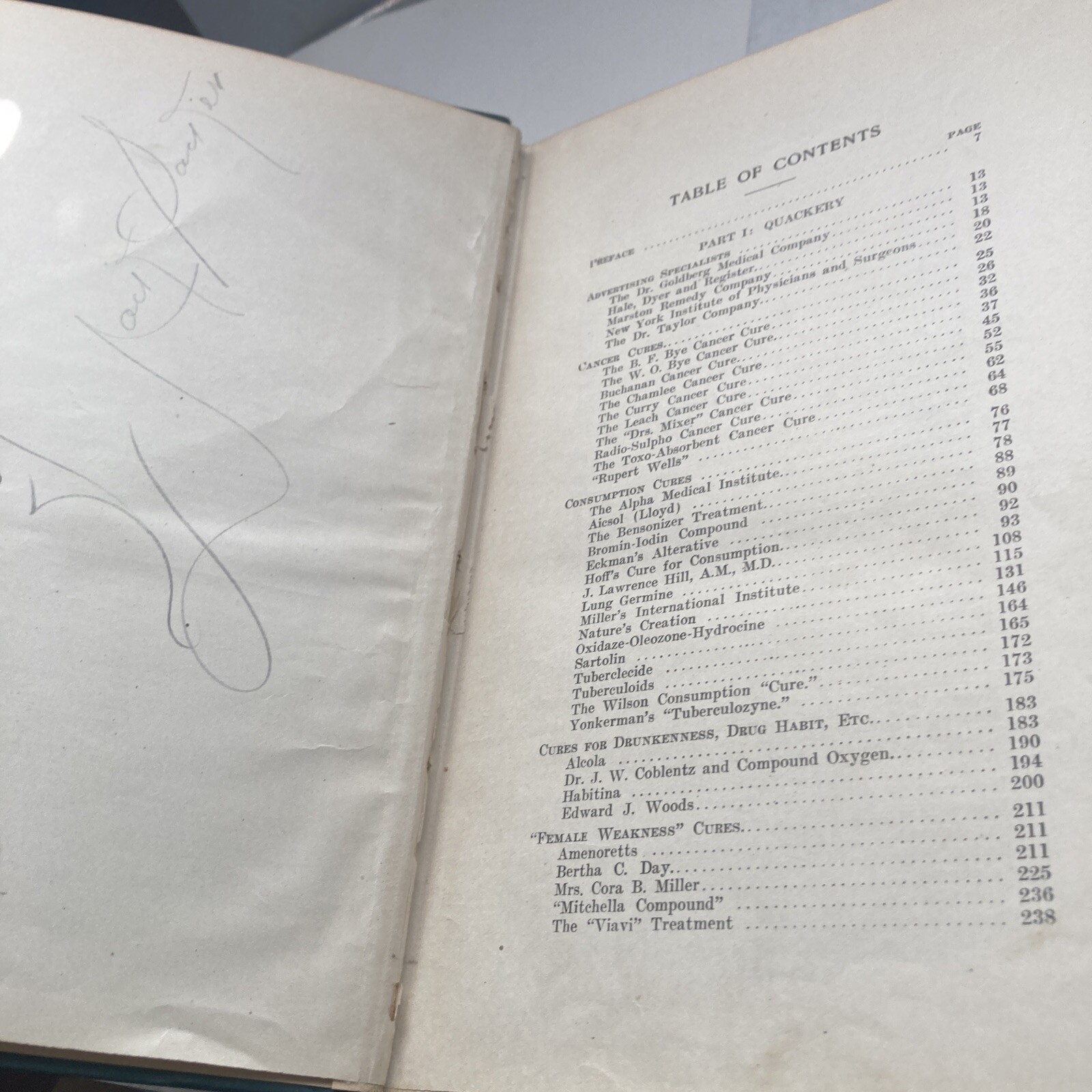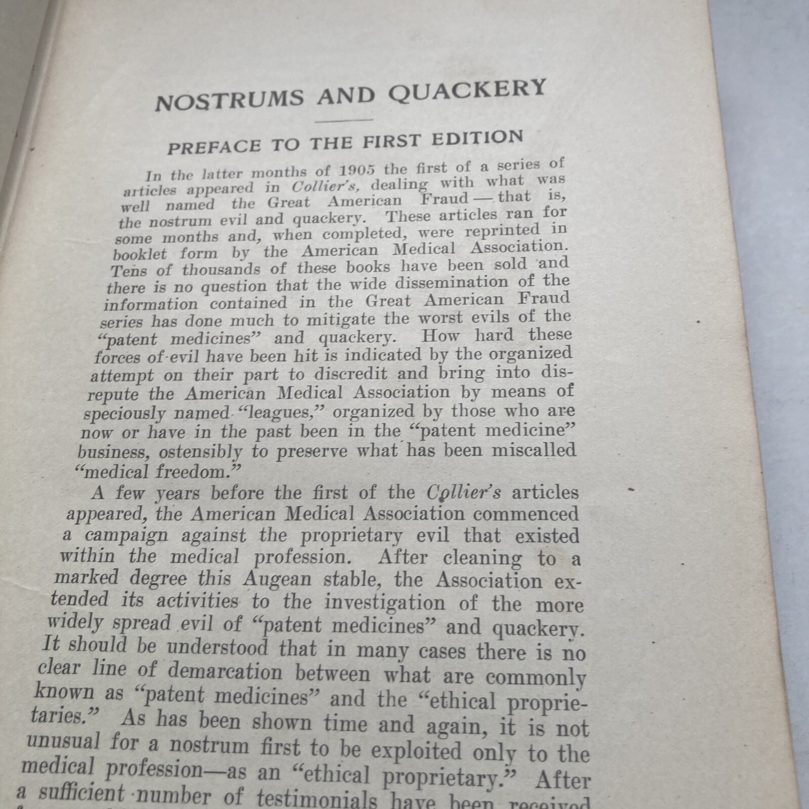 1912 NOSTRUMS AND QUACKERY, Illustrated, Quack Pseudo Medicine, 2nd Edition. Nice condition copy of "NOSTRUMS AND QUACKERY" - Articles on the Nostrum Evil and Quackery Reprinted, with Additions and Modifications, from The Journal of the American Medical Association. 1912 2nd edition (stated); American Medical Association Press; Chicago. The book is profusely illustrated, including numerous reproductions of advertisements for quack medicinal products. ("Nostrum" is defined as "a medicine sold with false or exaggerated claims and with no demonstrative value; quack medicine.") Here are a few examples of the contents: Prescriptions Fakes; Seasickness Cures; Misbranded Drugs and Foods; Laxatives; Habit-Forming Nostrums; Obesity Cures; Cure-Alls; "Baby-Killers"; Food Tonics; Mechanical Fakes; Mail-Order Medicinal Concerns; Hair Dyes; Cancer Cures. And much more. Condition: The book is in very good condition - clean both inside and out with only some light foxing to some random text pages. Tight binding with no cracks and no loose pages. Sharp corners. Bright gilt lettering on the front cover and spine. Overall, a very nice copy. BOOK3/35
