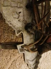 1920's-30's Art Deco Wall Sconce Lamp Made By Mich Chan Co. There is paper peeling off of the candle stick portion of the socket on one side. There is sharpie writing on each bulb. Each bulb has paint chipping off. There is paint chipping off of various areas on the lamp. This fixture has not been tested. Very neat original light fixture. Would look great in a period correct home. This piece may require some cleaning.
