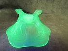 This measures 2-1/2" X 5-1/8", it is the uranium glass and glows bright under black light. These is a shallow shiny spot on the edge, it is not sharp or rough, but looks like a shallow flake, see photos, it may be a manufacturing flaw.
