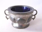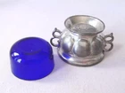1930s Pewter OPEN SALT CELLAR, Cobalt Blue Glass Insert, Pierced Handles 1930s Pewter OPEN SALT CELLAR, Cobalt Blue Glass Insert, Pierced Handles Click images to enlarge Description 1930s OPEN SALT CELLAR, COBALT GLASS INSERT Lovely old heavy metal open salt cellar measuring about 1-1/3" deep and 2" wide. Featuring a charming molded shape with short pedestal foot and pierced handles, it is fitted with a removable cobalt blue glass insert. Marked with a triangle and illegible lettering on the base (I think by Just Anderson), it is either spelter with a plated finish or pewter with a plated finish. Condition is very nice with overall plating loss - glass insert has no damage. Think this is such a pretty little open salt - color is a rich cobalt blue - hoping someone can use it - fun addition to any collection, table, or display! If questions, please contact me - thanks! Images sell! Get Supersized Images & Free Image Hosting Create your brand with Auctiva's Customizable Templates. Attention Sellers - Get Templates Image Hosting, Scheduling at Auctiva.com. Track Page Views With Auctiva's Counter
