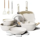 19 Pcs Pots and Pans Set Non Stick Ceramic Cookware Set with Removable Handles, Non Toxic Induction Kitchen Cookware Sets RV Cookware,Dishwasher/Oven Safe PFAS/PTFE/PFOA Free Cream White Item Description About this item Non Toxic Ceramic Coating - Made of natural ceramic, our kitchen cookware set is Teflon-free and guarantees no PFAS, PTFE, PFOA,PFOS, lead, or cadmium.Stain-resistant and durable for long-lasting use; Ideal choice for safety-conscious families, especially those with babies Optimized Storage Idea - Save 70% space by neatly stacking pots and pans in cabinets. Whether you have limited storage or simply wish to keep your kitchen neat and organized, our stackable cookware will be your go-to choice Innovative Detachable Handles - The detachable handles can be effortlessly removed and reattached whenever needed. Transform pots with a "CLICK" into baking dishes, serving plates, or fridge storage, enhancing versatility Ultra Non-Stick Performance - With a non-stick surface, these cookware set ensures effortless food release. Also it requires less oil or butter for healthier cooking options Easy Cleaning - While our cookware is dishwasher-safe for your convenience, we highly recommend handwashing. A simple rinse or quick wipe effortlessly removes any residue. Detach the handle when not in use while heating, care better for a longer life span. Universal Cooktop Compatibility: Enlarged, thickened magnetic base ensures compatibility with all stovetops, including induction and oven; Crafted from recyclable aluminum ensures lightweight yet sturdy, and promotes rapid and even heating 19-Piece Set Includes: 8-inch & 10-inch Frying Pan,1.6Qt/7-inch Saucepan & 3.6Qt/9.5-inch Casserole,2.7Qt/10-inch Sauté Pan & 11-inch Grill Pan,Removable Handles *2, 9.5-inch & 10-inch Silicone Lid,7" Fridge Lid, Silicone Utensils *3(Slotted Turner&Soup Ladle&Tongs), Pot Protectors *5 › See more product details *PFAS/PTFE/PFOA Free Natural Material Coating, Perform Well on Low to Medium Heat Safety First - Our cookware features natural ceramic nonstick,setting it apart from Teflon - free from harmful chemicals and heavy metals such as PFAS,PTFE,PFOA,lead, and cadmium.Prioritize your health with a toxic-free cooking experience.Built for Last - Stain & scratch-resistant,keeps great nonstick performance. With good care and reasonable use, our ceramic cookware could stay quite long even after years. *Safety First - Our cookware features natural ceramic nonstick,setting it apart from Teflon - free from harmful chemicals and heavy metals such as PFAS,PTFE,PFOA,lead, and cadmium.Prioritize your health with a toxic-free cooking experience. *Built for Last - Stain & scratch-resistant,keeps great nonstick performance. With good care and reasonable use, our ceramic cookware could stay quite long even after years. *Stay Away from Annoying Stains Ultra Smooth & Nonstick Smooth interior surface makes it exceptionally nonstick - you can effortlessly cook your favorite dishes without worrying about food sticking to the pans. *Hand Wash Recommend/Dishwasher Safe Cleaning Could Be Such a Breeze The non-stick feature not only enhances your cooking experience but also makes cleaning up a breeze. Say goodbye to stubborn food remnants and sticky residue! With just a quick wipe or gentle hand wash, these pans are ready to shine again. *Quick Dishes Serving Unlock the boundless potential of the cookware with its detachable handle – perfect for cooking on any stovetop or serving as elegant dinnerware on the table. *Easy Baking Prep From stovetop to oven, you can seamlessly transition from sautéing ingredients to finishing off your dish in the oven without having to transfer your food to a separate baking dish. This versatility not only saves time but also ensures even heat distribution for consistent cooking results. *Simple Fridge Store Store leftovers in the fridge with the included lids to minimize waste. *Fast Water Strain The build-in strainer at the edge of the lid can easily filter water or soup, without worrying the food will fall through. *Free Outdoor Cooking Detachable handle significantly reduces the size and weight of the cookware, making it incredibly portable and space-saving. Now you can effortlessly pack your cookware set for outdoor picnics, camping trips, or fitting it snugly in your RV kitchen. Introducing our innovative Removable Handle Cookware Set, designed to revolutionize your cooking experience. With seamless flexibility at just a click, this set offers endless possibilities that traditional cookware simply cannot achieve. Smooth interior surface makes it exceptionally nonstick - you can effortlessly cook your favorite dishes without worrying about food sticking to the pans. The non-stick feature not only enhances your cooking experience but also makes cleaning up a breeze. Say goodbye to stubborn food remnants and sticky residue! With just a quick wipe or gentle hand wash, these pans are ready to shine again. Unlock the boundless potential of the cookware with its detachable handle – perfect for cooking on any stovetop or serving as elegant dinnerware on the table. From stovetop to oven, you can seamlessly transition from sautéing ingredients to finishing off your dish in the oven without having to transfer your food to a separate baking dish. This versatility not only saves time but also ensures even heat distribution for consistent cooking results. Store leftovers in the fridge with the included lids to minimize waste. The build-in strainer at the edge of the lid can easily filter water or soup, without worrying the food will fall through. Detachable handle significantly reduces the size and weight of the cookware, making it incredibly portable and space-saving. Now you can effortlessly pack your cookware set for outdoor picnics, camping trips, or fitting it snugly in your RV kitchen. Constructed with enlarged aluminum conductive base, heat could transfer quickly and evenly. Whether you're seari