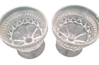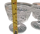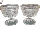 This set of two footed sherbet bowls or dessert dishes from Anchor Hocking's Wexford product line is a beautiful addition to any collection. The vintage bowls are made of clear glass with etched decorative features and a glossy finish. Measuring 3.75 inches in length, 3.75 inches in height, and 3.5 inches in width and diameter, the round-shaped bowls have a depth of 2.5 inches and are perfect for all occasions. Handmade with care instructions of hand wash only, these original vintage bowls are a mid-century modern style and were produced using fused glass technique in the United States in the 1970s. The set includes a dessert bowl and a bowl set and has antique value. The bowls are unmarked and come from an adult department.