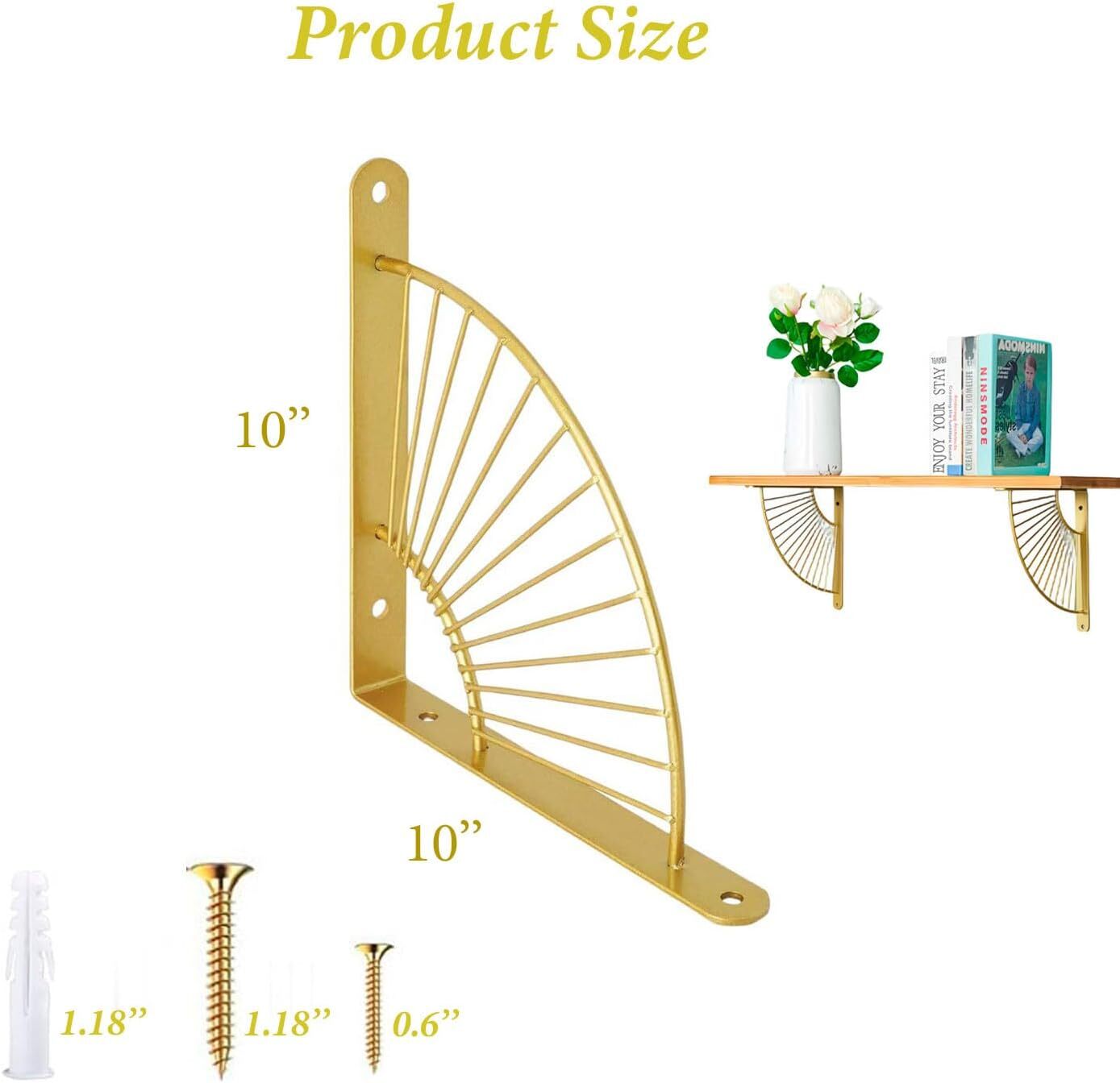 2 Pack Gold Shelf Brackets 10 inch Metal Shelves Bracket Wall Mounted Heavy D... 【Material】 The shelf brackets are made of high quality and is heavy enough to support maximum (80lb) weight. The heavy duty shelf brackets will add extra storage room for you. It is perfect for most DIY opening shelving project. Note: Please confirm product size before purchase. 【Easy installation】 For fixing screws on any wall or wooden surface, mark and drill pilot holes with a drill bit appropriate for the mounting hardware. Insert and tighten the screw. 【Size】10'' long suitable for floating 10-12 inch deep wooden shelves. Sturdy enough for your home decor. 【Wide Application 】This multi-purpose shelf supports could be used for any shelf install, ideal for the kitchen, bathroom, bedroom, office & more. It is a perfect decorative bracket for wood, especially for creating a trendy style. 【Package Contain】 2Pcs of 10 inch shelf bracket and all necessary hardware. All our wall brackets are packed in an individual bags to prevent any scratch during transportation. (board is not included).
