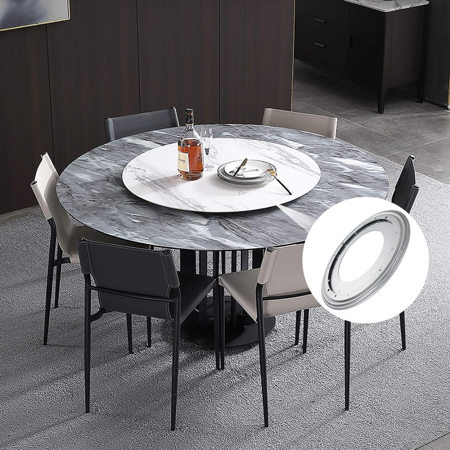 High-Quality Turntable Bearings: Rotating Bearing Plate is made of 5/16" thick galvanized sheet, corrosion resistant and can safely handle loads up to 1000 lbs Smooth Turning with Less Noise: Swivel bearing has a deeper race groove. Encapsulating the balls more effectively and allowing them to move more smoothly Easy to Install: Lazy Susan turntable has pre-punched holes for easy installation, You can use it as a dining table centerpiece, an art product display, round wood tray, revolving media tower, TV monitor stand, rotating dollhouses and other DIY Lazy Susan Package includes: 2 x 12" Lazy Susan Ball Bearing Turntable; 5/16" in thickness, heavy-duty turntable suitable for 15"-30" Diameter work surface, mounting screws not included Wide Application: Use them for revolving shelves in kitchen cabinets, planters, serving platters at the table, large tabletops or making rotating work station, rotating table, bookcase, serving tray, DVD tower, corner shelves, shoe rack, corner cabinets, storage solutions, chalk spinners, turntable kaleidoscopes, tabletop serving, pop displays, magazine racks, movie poster displays Features : Zinc-plated for resistance to corrosion Load capacity of 1000 pounds Twelve-inch square plate Ball bearing raceway for smooth rotation Mounting screws not included Specifications: Type: Round Lazy Susan Swivel Diameter: 12 Thickness: 5/16 Load capacity: 1000lbs Material: Steel Color: Silver Package Include: 2 x 12 Lazy Susan Hardware