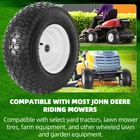 EXACT 16 X 6.50-8 TUBELESS TIRE AND WHEEL ASSEMBLIES - They're an exact for 16x6.5-8" tubeless mower tire and wheels, with John Deere Riding Mowers and most Mowers. 16 inches outer diameter, 6.6 inches section width, and 8 inches rim size. WITH MOST JOHN DEERE RIDING MOWERS: with select yard tractors, lawn mower tires, farm equipment, and other wheeled lawn and garden equipment. These are NHS tires not for use at highway speeds. Check the sidewall of your riding mower's existing front tires for information on the exact size of the tire and wheel. 3" OFFSET HUB AND 3/4" BEARINGS - This 2-pack tire and wheel assembly are also with other brands and models of riding mowers and lawn tractors. Aside from having the exact wheel size, you should also ensure that your existing riding mower's wheel assembly has a 3-inch offset hub and a 3/4-inch diameter Bearings. (Extra 5/8" Bearings x 4pcs; metal washers x 12pcs) 600 LBS MAXIMUM LOAD RATING - These tires were made for hauling and carrying relatively heavy loads. Not for highway service (NHS) tires like these are 4-PLY with a maximum PSI of 30. Made from premium quality rubber compounds that remain reliable and durable throughout all seasons. And with a maximum load capacity of 600 pounds for each tire and wheel assembly, you can do more for less. TURF TIRE TREAD FOR MINIMAL SURFACE DISTURBANCE - Mainly designed for turf, the treads on these tires have shallower depths and a wider footprint to minimize disturbance and damage on turf, natural grass, and other sensitive surfaces. These treads also offer stability on gravel and sand. There's also a noticeable improvement in both traction and maneuverability compared to regular tires.