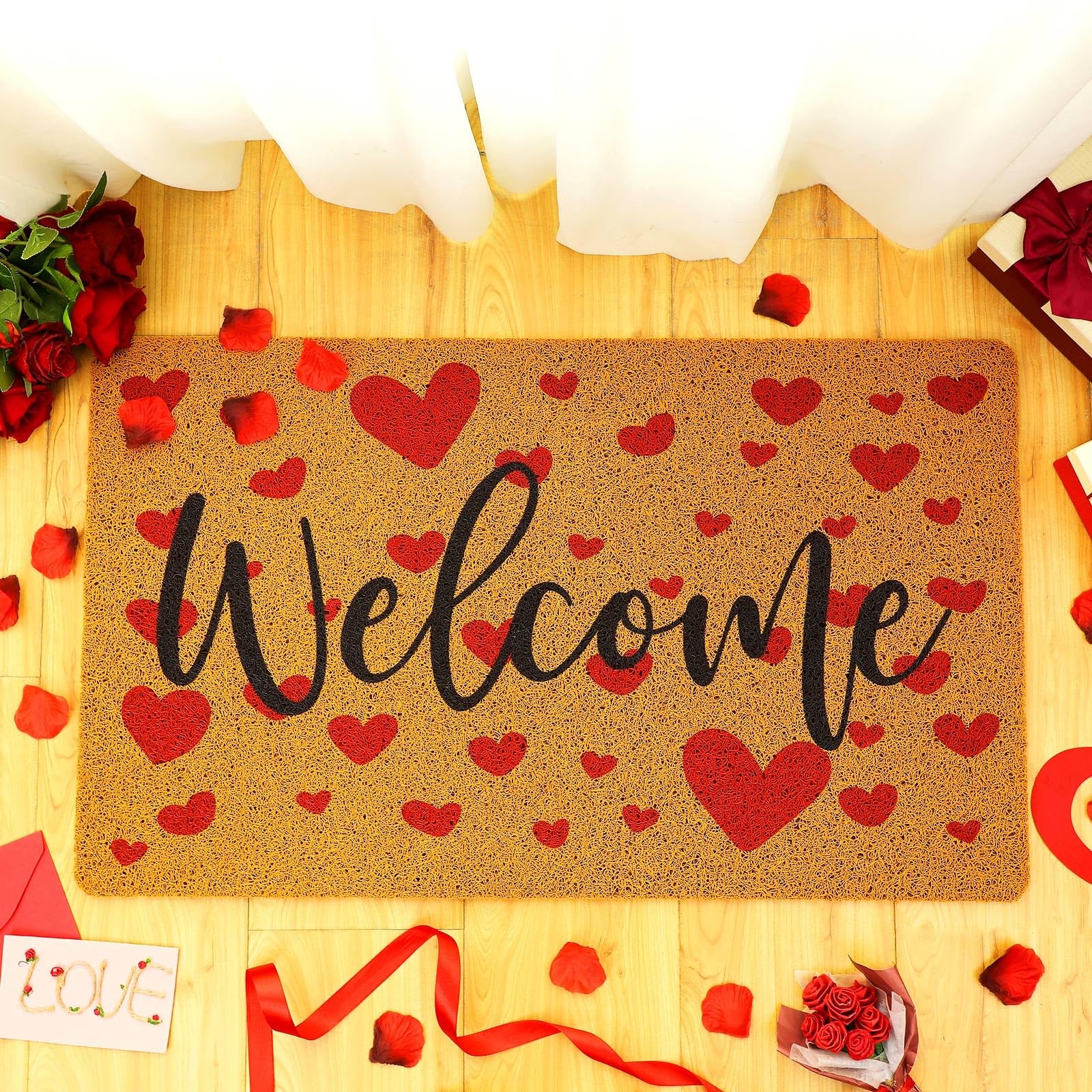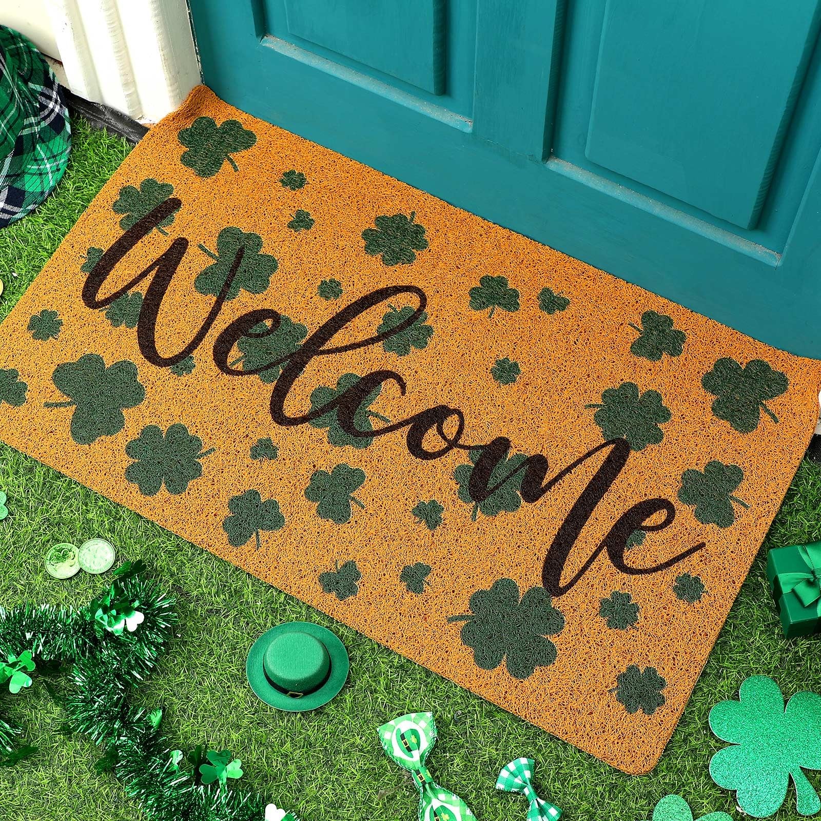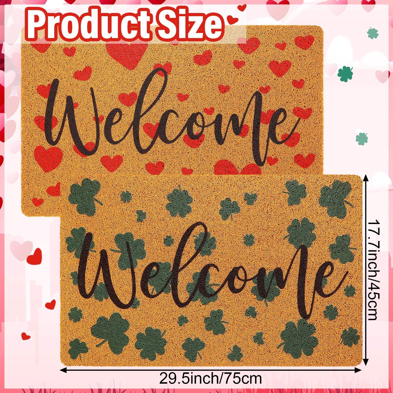 Features: Festive decoration: The holiday inspired designs of these welcome door mats are fit for adding a touch of warmth and cheer to your home during special occasions such as Valentine's Day and St. Patrick's Day. The red hearts and green shamrocks are eye catching and inviting, making your guests feel welcome and comfortable. They're also an ideal way to showcase your festive spirit and add a sense of color to your home decor. As gifts: These heart and shamrock door mats make ideal gifts for family and friends who appreciate practical yet stylish home decor accessories. They're suitable for housewarming parties, weddings, birthdays, or other special occasions. The festive designs add a personal touch to your gift and show that you care about their well being. Specifications: Material: imitation coconut, nonslip rubber backing Color: as pictures show Size: about 17.7 x 29.5 inches/ 45 x 75 cm Styles: red hearts, green shamrocks Package includes: 2 x Imitation coir welcome door mats Notes: Manual measurement, please allow slight errors on size. The color may exist a slight difference due to different screen displays. Package Content: each package contains 2 imitation coir outdoor welcome mats for front door in 2 styles, providing you with a spare mat or allowing you to use them in multiple locations; The doormats are printed with the word 'Welcome', one has red Valentine's Day hearts, and another has St. Patrick's Day green shamrocks; You can use one mat at the front door and another at the back door, or use them in different rooms of your house Large Size: measuring about 17.7 x 29.5 inches/ 45 x 75 cm, this welcome rug is large enough to accommodate most doorways and provide ample space for wiping shoes; The size is suitable for households with high traffic areas, ensuring that people can wipe their shoes before entering the house; The large size also makes it suitable for commercial use in restaurant, office, or other public spaces; You can stick these 2 doormats together or separate them at different entrances to welcome your guests Quality Material: the large welcome mat is made of quality imitation coconut material with a nonslip rubber backing, providing good protection against dirt, mud, and water, easy to clean; The imitation coconut material is reliable and long lasting, and strong stitching and sturdy finish ensure that these 2 door mats will serve you well for a long time; The nonslip rubber backing prevents the mats from slipping or sliding, keeping them in place and keeping you safe from accidental falls Hearts and Shamrocks Design: the festive holiday styles of these coir doormats make them an ideal addition to your home during special occasions; They add a touch of warmth and cheer to your guests' arrival, making them feel welcome and comfortable; You can use them to decorate your home during Valentine's Day, or St. Patrick's Day, Irish Day, daily life, or other special occasions that call for a festive touch, standing on them to avoid direct contact with the cold ground Wide Application: these outdoor door mats for outside entry are versatile and can be applied in a variety of indoor and outdoor areas, such as your front door, back door, porch, patio, garage, kitchen, bathroom, living room, bedroom, laundry room, office, and more; Their quality material and nonslip rubber backing make them suitable for high traffic areas that are prone to dirt and water; They're also easy to clean and maintain, making them a practical choice for busy households