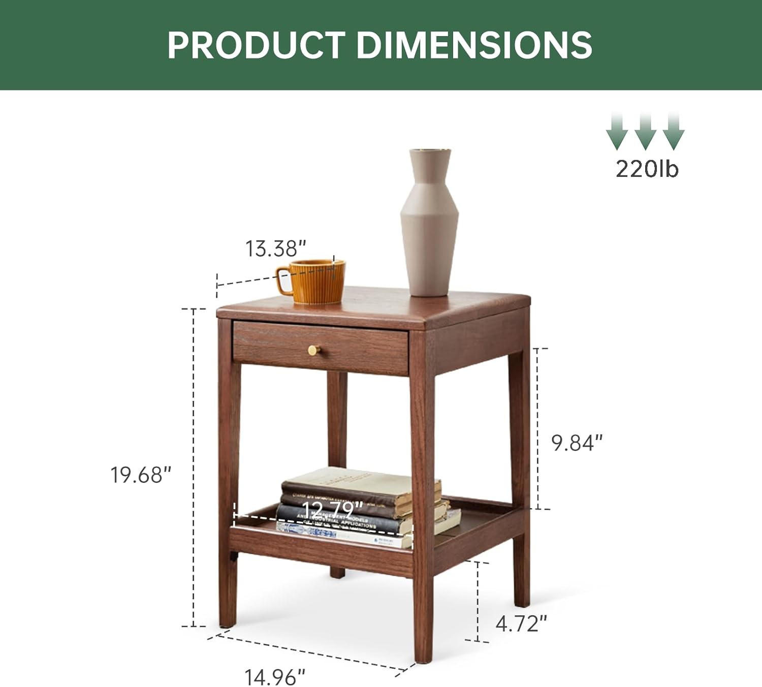 Product Description About this item • 【Modern Aesthetic Design】This end tables living room features a rustic walnut veneer and a square base, bringing a warm touch to any room. The design of the compartments and drawers also adds a touch of convenience for easy storage. • 【Ample Storage Options】This living room tables has a spacious tabletop, lower shelves, and drawers with brass handles that can store drinks, books, or precious souvenirs, making it perfect for maximizing functionality in small spaces. • 【Sturdy and Durable Construction】Crafted with quality 100% FAS grade solid oak, this small coffee table supports up to 200 pounds, guaranteeing a stable and enduring structure for everyday use. • 【Space-Saving and Versatile】 Measuring 13.3"D x 14.9"W x 19.6"H, this compact wooden end table fits perfectly next to an armchair or couch, serving as a drink table, bedside table, or even a plant stand in your living room or bedroom. • 【Quick and Easy Assembly】Set up your rustic brown small side table in just about 10 minutes with clear instructions and labeled parts, allowing hassle-free assembly, even for those less experienced with furniture setup. Solid Wood Slides Small and shallow drawer, put your trivial things here. Protective Edge Attentive edge, large pieces are not easy to fall off 2 Tier Design Small size, large capacity. Multi-scenario use It can be used as a side table in the living room, a bedside table in the bedroom, and a bookshelf in the study. Different colors available On Aug 17, 2025 at 19:25:56 PDT, seller added the following information: