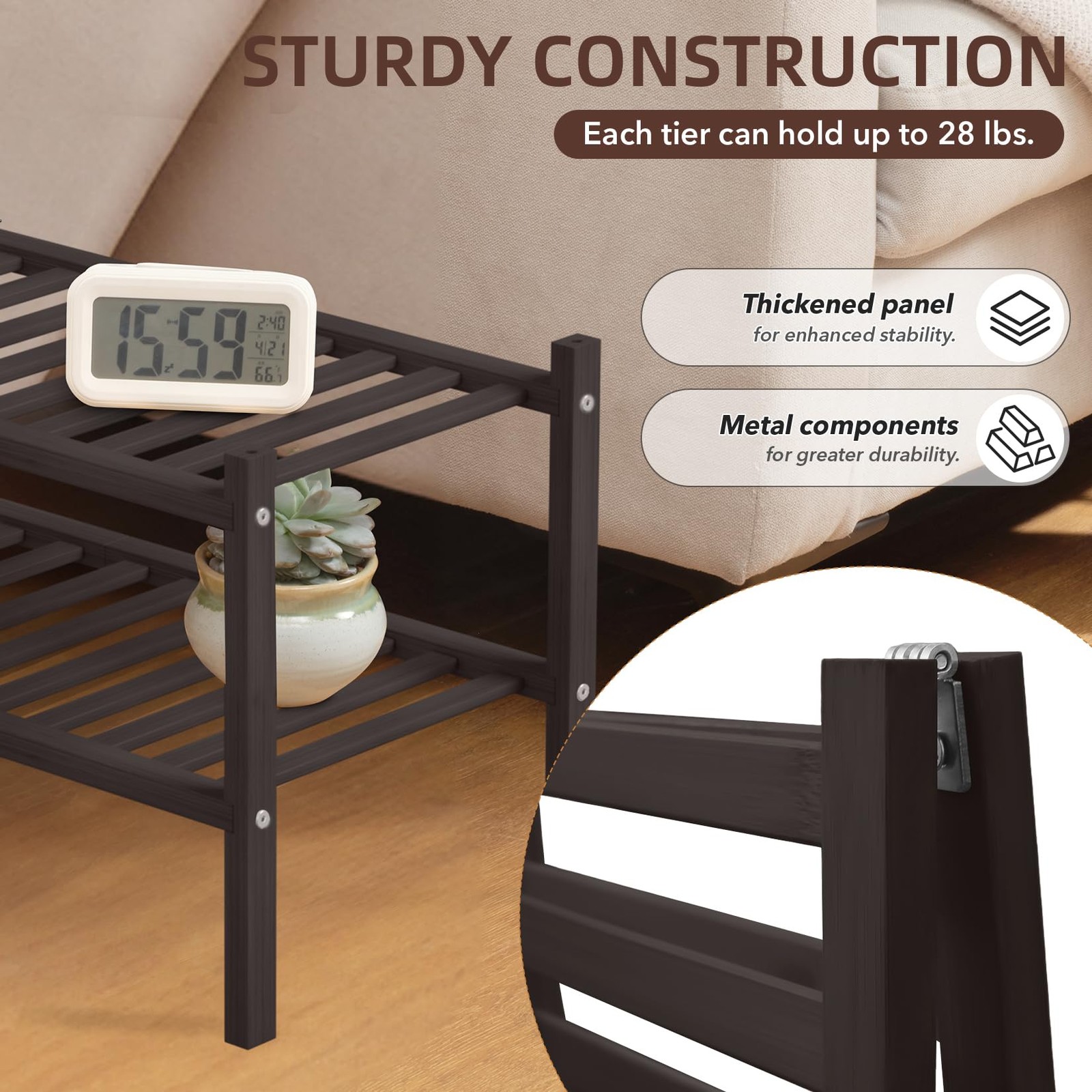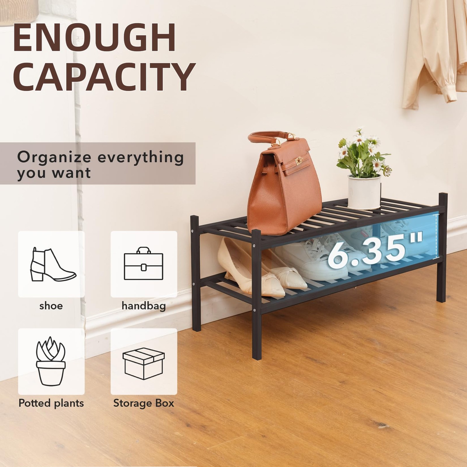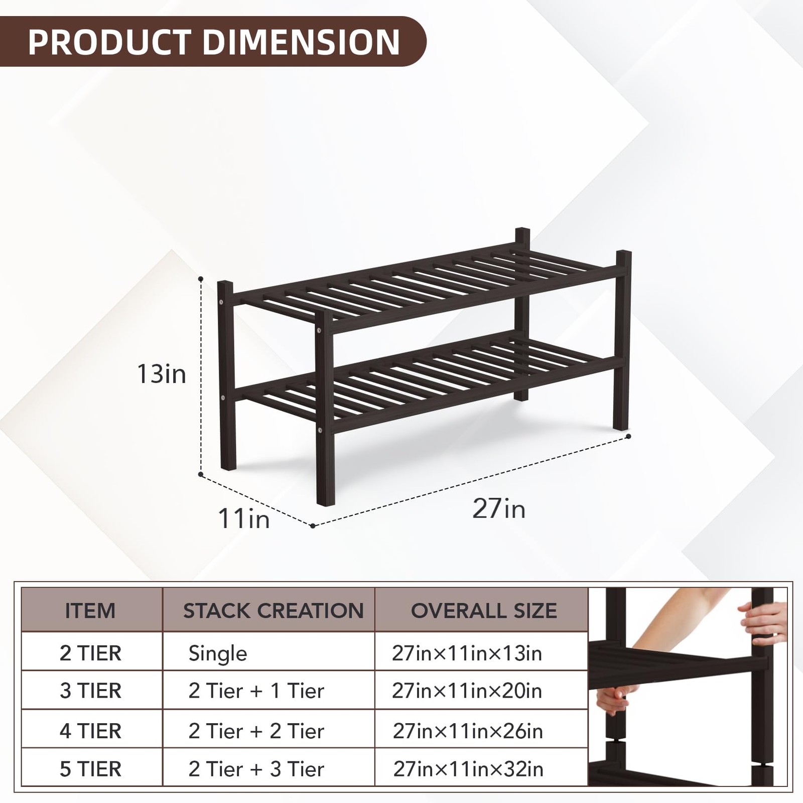 2 Tier Bamboo Shoe Rack Storage Organizer for Closet, Multifunctional Stackable Free Standing Shoe Shelf Organizer for Small Space,Entryway, Hallway, Bathroom27"x11"x13" (Brown, 2 Tier) Stackable Design: Each type of shoe rack is stackable, and you can design the height you want according to the needs of your living space. For example, two 2-tier shoe rack units can be stacked into a 4-tier shoe rack, or two 3-tier shoe rack units can be stacked into a 6-tier shoe rack. We have 2 colors and 4 heights for you to choose from, creating your unique living space Large Capacity Space: This stackable shoe rack utilizes space through adjustable layers, making a small space three-dimensional and allowing you to store many things. Each tier is about 6.35" high,enough to store what you want. Each tier can hold three pairs of shoes without crowding, and reasonable space utilization makes your home more tidy and orderly Natural Materials: Natural bamboo growth fills the home with a natural atmosphere. Using naturally grown bamboo as the material, it is finely cut and subjected to high-temperature carbonization treatment to become sturdy and durable. The careful polishing process and fine coating technology make the surface of the bamboo shelf smooth, without harming your skin and clothing Multi Functional Storage: This shoe organizer keeps your shoes organized, with 4 heights to choose from, suitable for most home environments. In addition, this shoe rack has multiple uses, and its simple and elegant design can help you organize daily necessities such as toiletries, towels, books, small plants, etc. in the bathroom, living room, office, and kitchen. It maximizes space utilization, simplifies structure, and helps you maintain a clean home No Additional Tools Required: The foldable shoe rack comes with illustrations and is easy to install. The package contains all the necessary tools, and with the accompanying screws and hex wrench, assembly can be easily completed. The shoe rack adopts a mortise and tenon structure and groove connection, which is very sturdy and durable. In less than ten minutes, you can complete the installation and get a practical shoe rack After-sales Service: The easy to assemble structure makes the bamboo shelf easy to maintain, and it only takes up space in a small box when stored. If you have any questions, please feel free to leave us a message. Our after-sales customer support team will reply to you within 24 hours