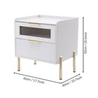 DESCRIPTION 【For rooms】Overall Dimensions of Table:17.7" L x 15.7" W x 20.5" H, It strikes a clean-lined rectangular silhouette.It offers you enough space for your various things. 【Versatile use】This bedside table is versatile. Whether as a coffee table, end table, beside table or console table, it is a space-saving storage table. In addition, its elegant style will give modern accents to beautify your room. 【Smart storage】This modern two-drawer nightstand provides a storage solution for remotes,your favorite books, keepsakes, glasses, and other necessaries at hand. The tabletop is perfect for displaying a lamp, clock, potted plant or photo frame to offer warmth and personalized decoration. 【No assembly required】You only need to simply install four table legs, saving you valuable time and effort. Enjoy a clean and tidy bedroom now. Describe: Product Dimensions: 17.7" L x 15.7" W x 20.5" H Material: Metal+MDF+glass+artificial leather Color: white + gold You only need to simply install four table legs, saving you valuable time and effort. Enjoy a clean and tidy bedroom now. Versatile and modern, leather, metal, glass are paired to create a modern, minimalist vibe. Smart storage, this two-drawer nightstand provides a storage solution for remotes, your favorite books, keepsakes, glasses and other necessaries at hand. Best for decorating,the tabletop is perfect for displaying a lamp, clock, potted plant or photo frame to offer warmth and personalized decoration. On Mar 2, 2025 at 21:29:37 PST, seller added the following information:
