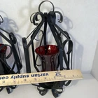 Great vintage find. Set of two black wrought iron Spanish hanging lanterns candleholders. Both have red Peg votives with grommets. Votives are in excellent condition, no chips or cracks. Wrought iron lanterns are in good condition with some patina. Please see pics carefully. All measurements are in pictures. Ships the next business day after payment.😊