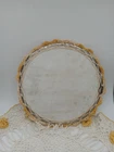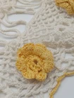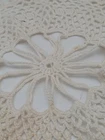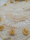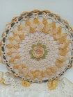 This vintage doily is a beautiful addition to any collection. The yellow rose pattern on a white background is eye-catching. Measuring 18 inches in diameter, this round doily is perfect for use as a tabletop the 6 inch doily has a hard back that it is fitted around and could be a trivet or wall hanging. Crafted from cotton and featuring crochet detailing. Its timeless design and high-quality materials make it a durable and versatile piece.