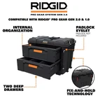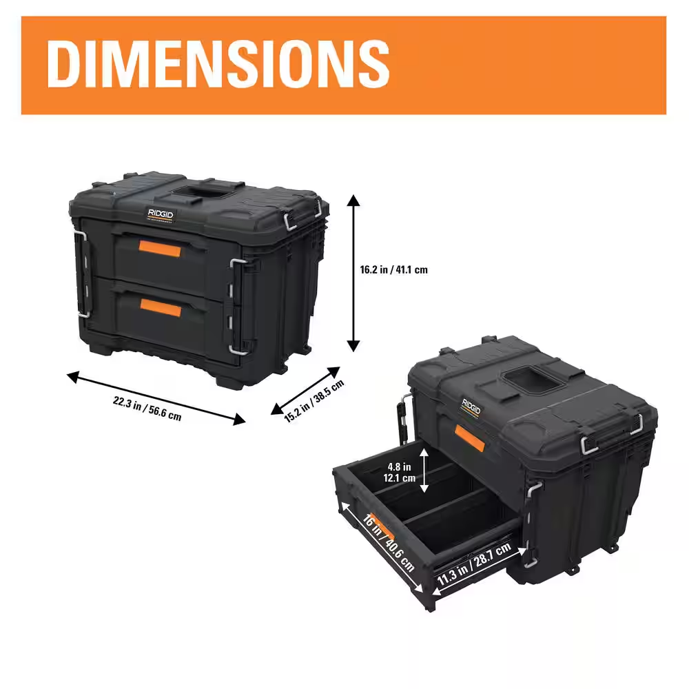 Features 2 deep drawers to store large and small-sized tools Made of high-impact resin to ensure durable use Padded handle offers a comfortable carrying experience The RIDGID 22 in. Pro Gear 2.0 XL 2 Drawer is made with high-impact resin for long-lasting performance. This Tool organizer is the most versatile and durable toolbox for any job site or worksite. This unique design offers 2 deep drawers to store large and small-sized tools with maximum ease and convenience. This RIDGID's Pro Gear 2.0 Tool box is a half-footprint connectivity with metal ball-bearing drawer slides and padlock eyelet for security. Each drawer is front-lockable for easy access and safe transport. Dividers are included to allow internal organization and storage of small parts and clear division in the drawers, for fast search and organization. The XL drawer toolbox is also compatible with the 2.0 cart for a quick Attach-and-Detach from the 9 in. wheels. You can be mobile and have the convenience of taking the drawer you need without unmounting the unit. This toolbox allows you to create an organized and functional workspace with its hanging drawers - Fix- and- Go mechanism. The XL drawer can be a base unit in the Pro Gear modular mobile system or create a full stack of unlimited access. The Pro Gear XL 2 Drawer is fully compatible with RIDGID's Pro Gear System 2.0 and 1.0 products, customized storage solutions for easy transportation, organization and more accessibility.