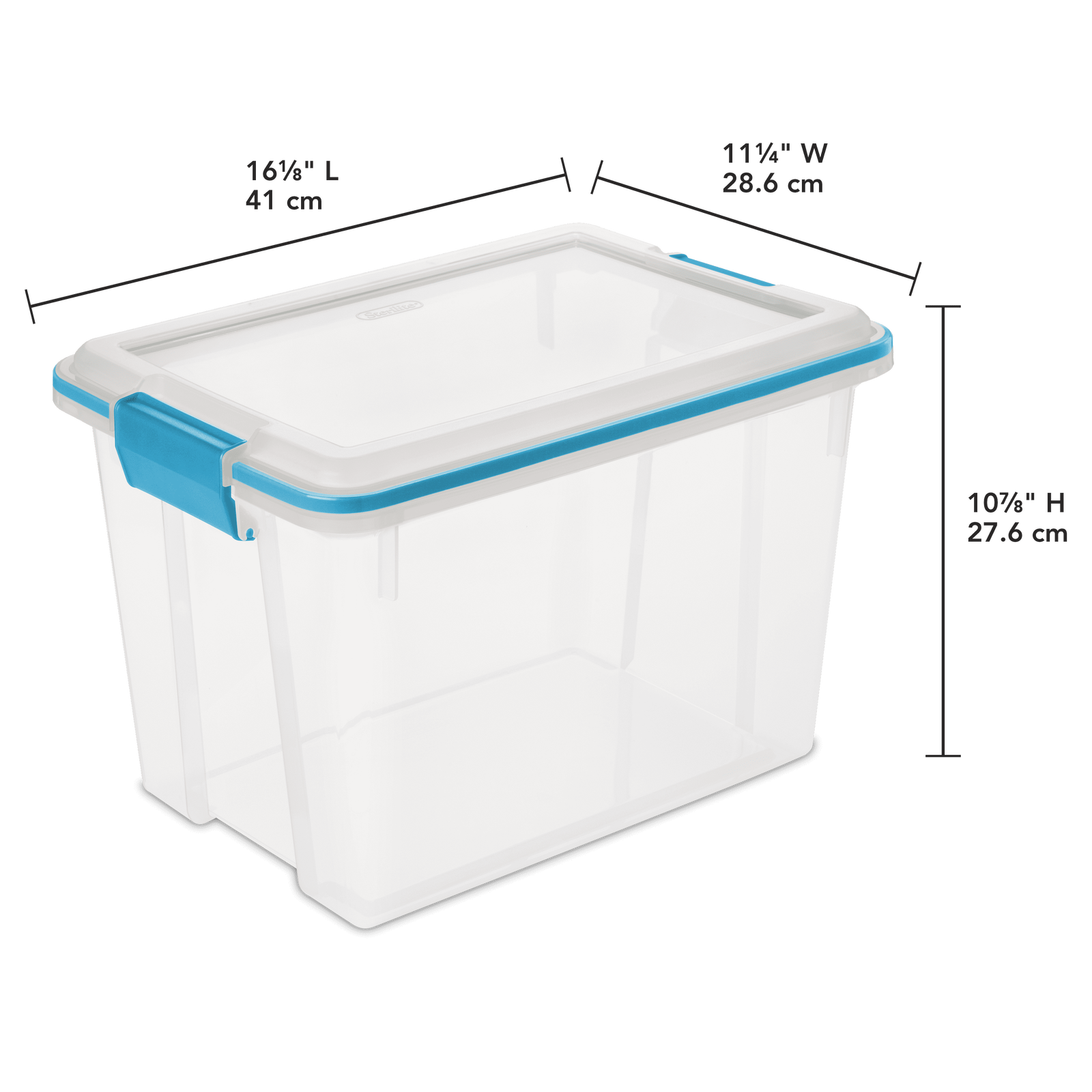 Sterilite's Gasket Box line is the ideal storage solution for keepsakes, photographs, important documents, linens, and other items that need to be stored away and protected. Gasket Boxes offer a gasketed seal to safeguard items from both air and moisture, keeping those special belongings safe from the elements, dust and pests. Durable, tight-fitting latches keep the lid secured to the base, and the clear lid and base allow contents to be easily identified, without opening the lid. The 20 Quart size is ideal for organizing school projects, paperwork and photographs that need to be protected, and fits conveniently on 16" wire closet shelving, making it ideal for organizing and storing small items in the closet. Sterilite 20 Quart Gasket Box, Weather-Resistant Clear Storage Bin with Lid, Blue Outside Dimensions: 16 1/8" x 11 1/4" x 10 7/8" Interior Dimensions at bottom: 12" x 8 5/8" x 9 5/8" Ideal solution for those items that need to be stored away and protected Gasketed seal safeguards items from air and moisture, dust and pests Durable, tight-fitting latches keep the lid secured to the base Clear base and lid allow for easy identification of contents, without having to open it BPA-free and phthalate-free