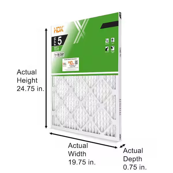 20 x 25 x 1 Standard Pleated Air Filter FPR 5, 3-Pack, Air Filters Replacement HDX filters are constructed of a durable, moisture-resistant frame with wire supported media for strength and rigidity. The wire-backed Pleated media offers a large surface area which increases the filter's dust-holding capacity and improves its efficiency. The air filter media can be charged electrostatically which means it attracts, captures and traps particles that would otherwise bypass the filter. The air filter's media is rated between a MERV 8 and 13, which is one component of the FPR Rating. FPR or the Filter Performance Rating, is composed of 4-measurements for classifying air filters. Every rating includes 4-elements: MERV rating, E1 efficiency, pressure drop and dust holding capacity. MERV stands for the Minimum Efficiency Reporting Value and measures how well a filter traps particles. The higher the rating, the few particles getting through. E1 efficiency explains how well it traps the smallest particles. Pressure drop measures how much energy the HVAC unit will use to force air through the filter. Dust holding capacity describes how much dust a filter will hold in its lifespan. HDX filters are easy to replace making change-outs quick and keeping indoor air quality at its optimal level while protecting your HVAC unit and allowing it to perform efficiently. HDX air filters capture and trap allergens, airborne contaminants and other particles Created to provide higher efficiency and better overall performance than standard pleated filters Works in furnaces, HVACs, wall vents and ceiling vents Item represents 3 filters that will last up to 3-month, per filter, in a typical household environment and can be reordered through our subscription service