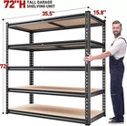 【2000LBS Capacity Garage Storage Shelves Heavy Duty】REIBII garage shelving heavy duty shelving has thickened steel legs. Made of high-quality metal frame+high-quality thicker boards,so each shelf can hold up to 400 lbs, with a total bearing capacity of 2000 lbs, which makes 5-tier garage shelving unit more stable, solid and more stuff can be stored. 【72 "H x 35.5 "W x 15.8" D Multipurpose storage shelves heavy duty】The garage shelves heavy duty shelving with perfect size is suitable for garage, pantry, closet, kitchen, warehouse, basement, living room, office, etc. The 5 tier metal shelving unit and storage shelves heavy duty not only expands your storage space, makes your home clean and orderly, is your best choice-best shelf organization for business. 【Adjustable Garage Shelf to Meet Different Needs】You can use your imagination to customize your own space. Metal shelving for garage storage is designed with adjustable connectors. The height of each layer is not only adjustable by moving the crossbar up or down to meet the different heights of varied objects needed, but also divided one shelf into two individual shelves, the link is able to provide more stability. 【Easy Assemble within 10 minutes】The heavy duty metal shelves for storage garage shelves adopts a special interlocking design to make it quickly assembled. To help you quickly assemble, we offer you a hammers and a pair of gloves. There is no nuts or bolts required, you can quickly assemble every stand alone sturdy shelves for storage within 10 minutes alone. 【Best Gift & Professional Support 】There are many parts in the package, Please tell us the first time if meet the case of missing parts and assembly. You don't have to worry about scratches on the floor of metal storage rack, which is perfect choice for gift-giving or housewarming. If you have any questions about our products, please feel free to keep our customer service.