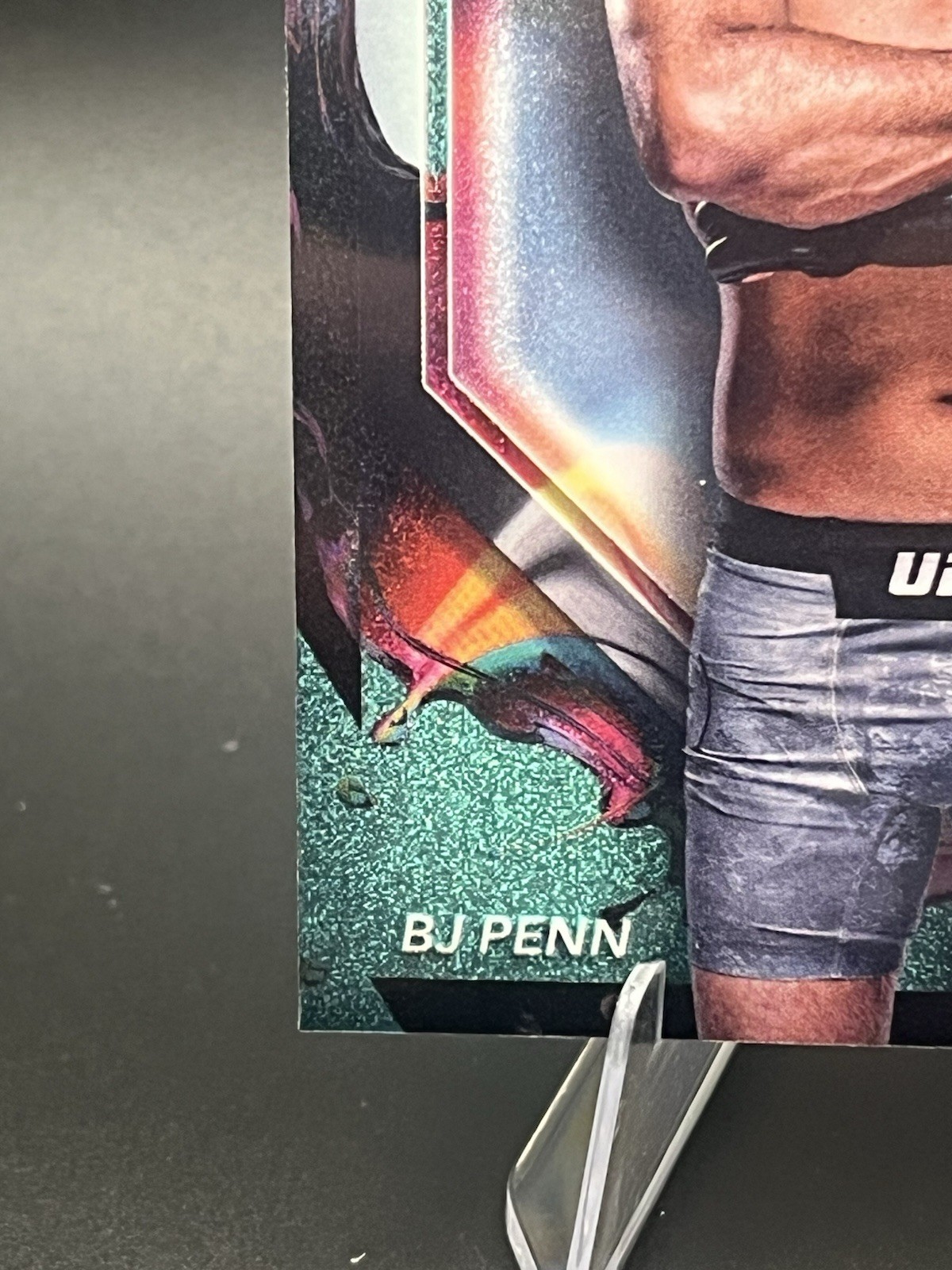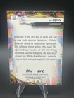 The product is a rare B.J. Penn trading card from the 2024 Topps Finest UFC set, featuring an Aqua Glitter Refractor parallel design. This collectible card is in near mint or better condition, making it a valuable addition to any MMA or UFC memorabilia collection. Manufactured by Topps, this card showcases the Ultimate Fighting Championship (UFC) athlete B.J. Penn in a unique and eye-catching design that sets it apart from other cards in the set.